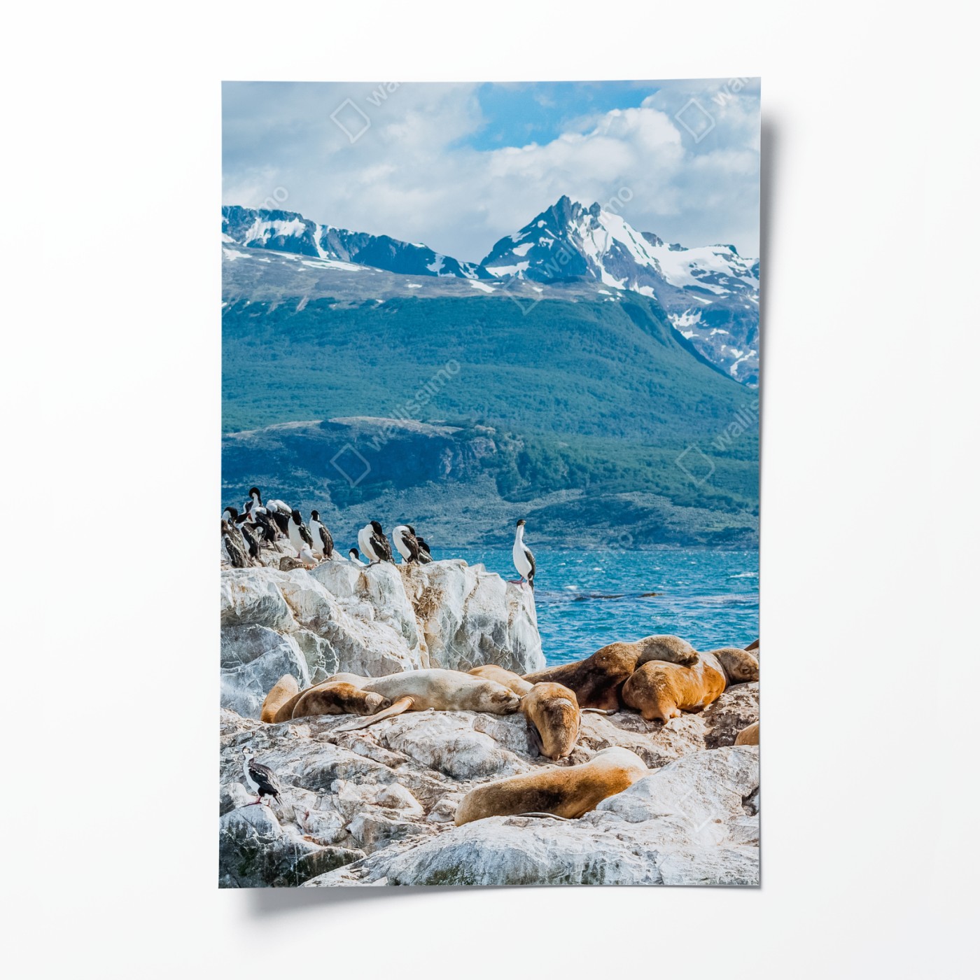 Bringen Sie die wilde Schönheit der Küste in Ihr Zuhause mit diesem lebendigen Foto von Seelöwen und Seevögeln vor schneebedeckten Bergen und türkisblauem Meer.MehrWeniger