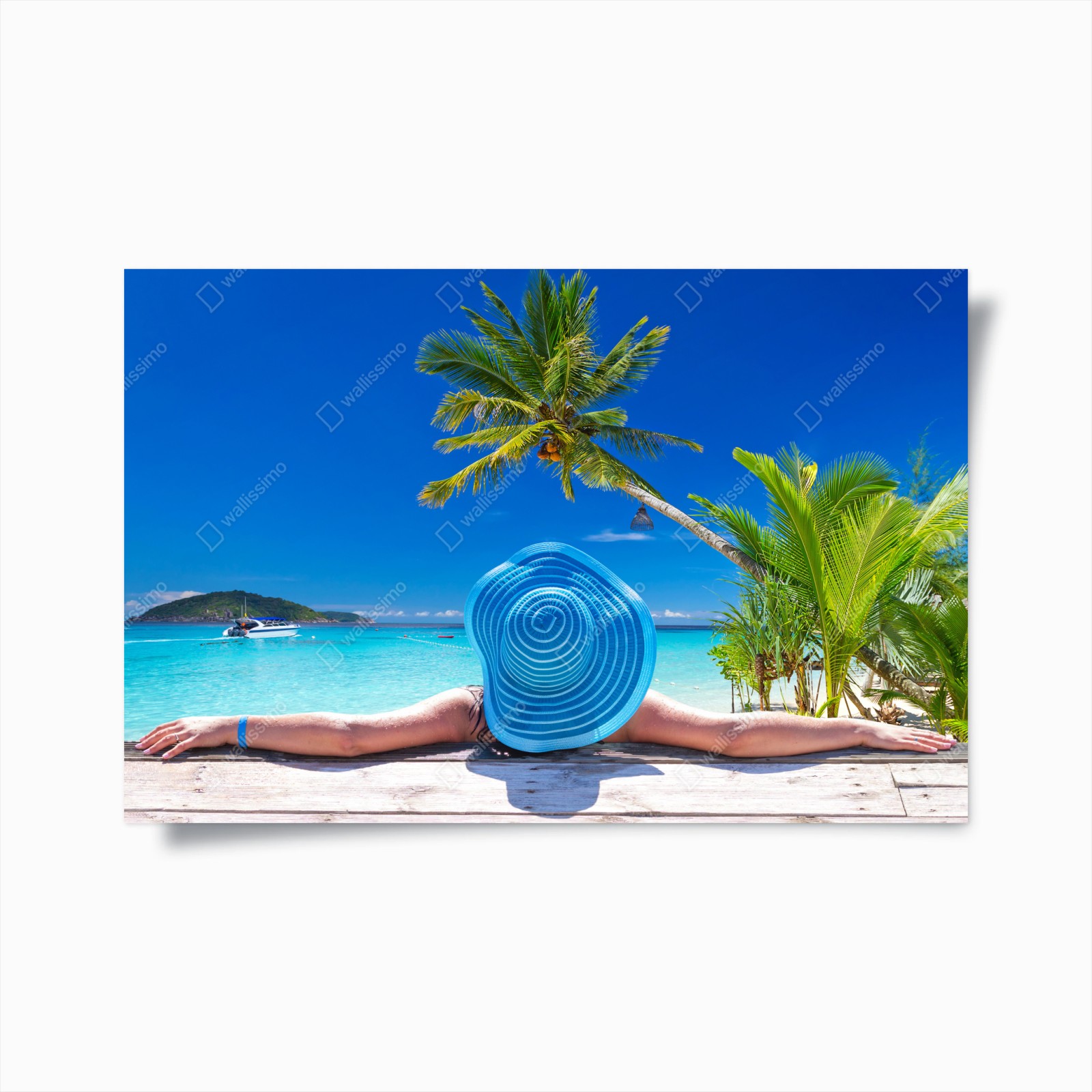 Poster Tropischer strand mit blauem sonnenhut