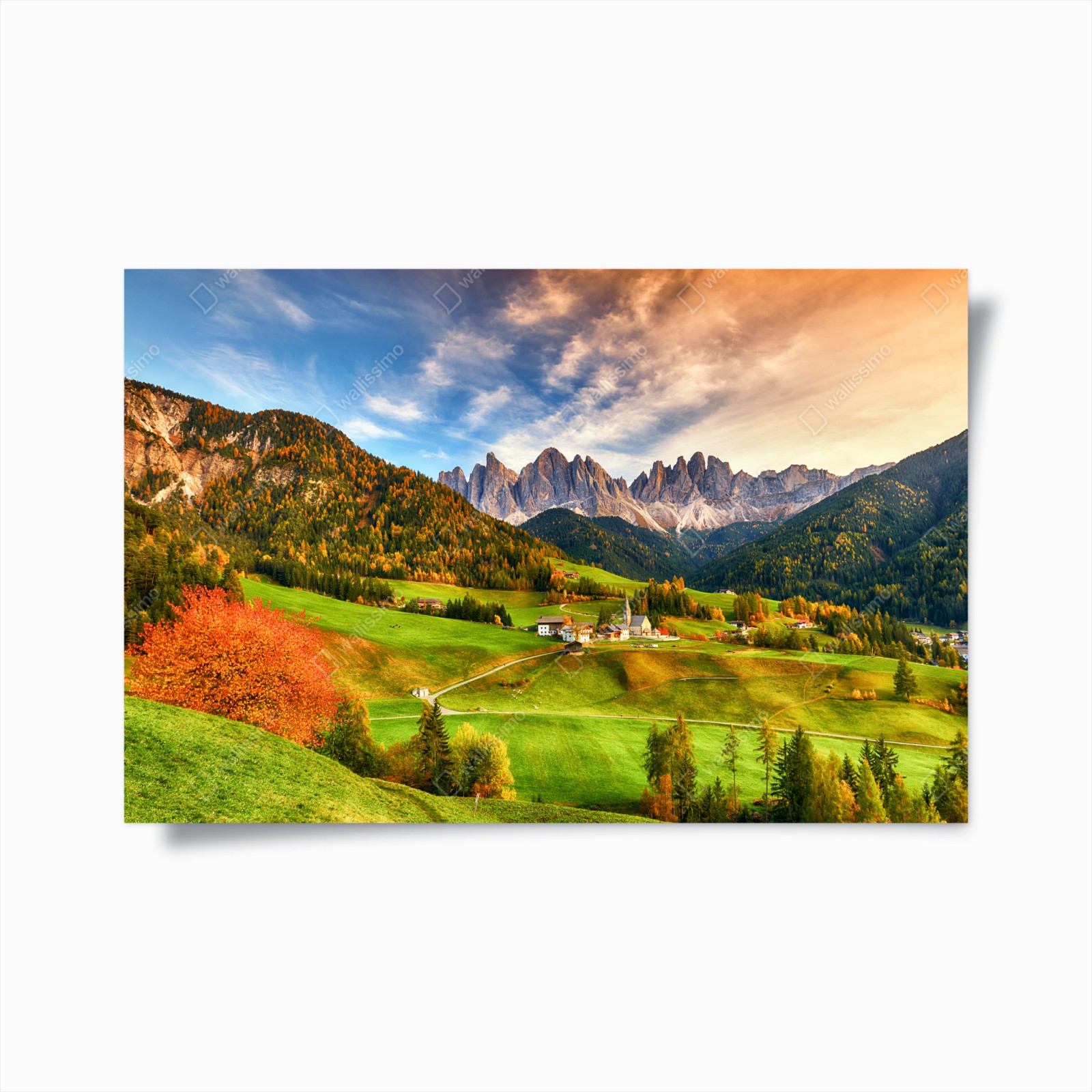 Poster Herbstlicher sonnenuntergang über Santa Maddalena, Dolomiten
