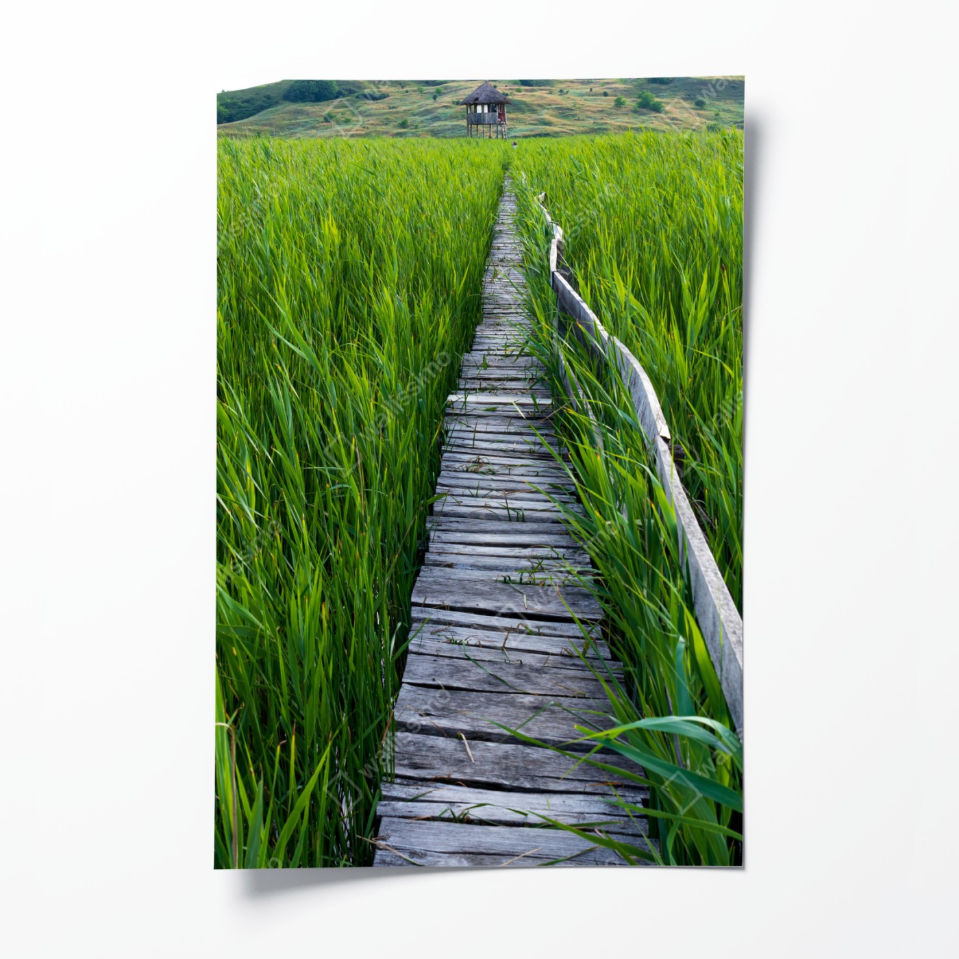 Poster Ruhiger grüner steg durch schilfland zur rustikalen hütte