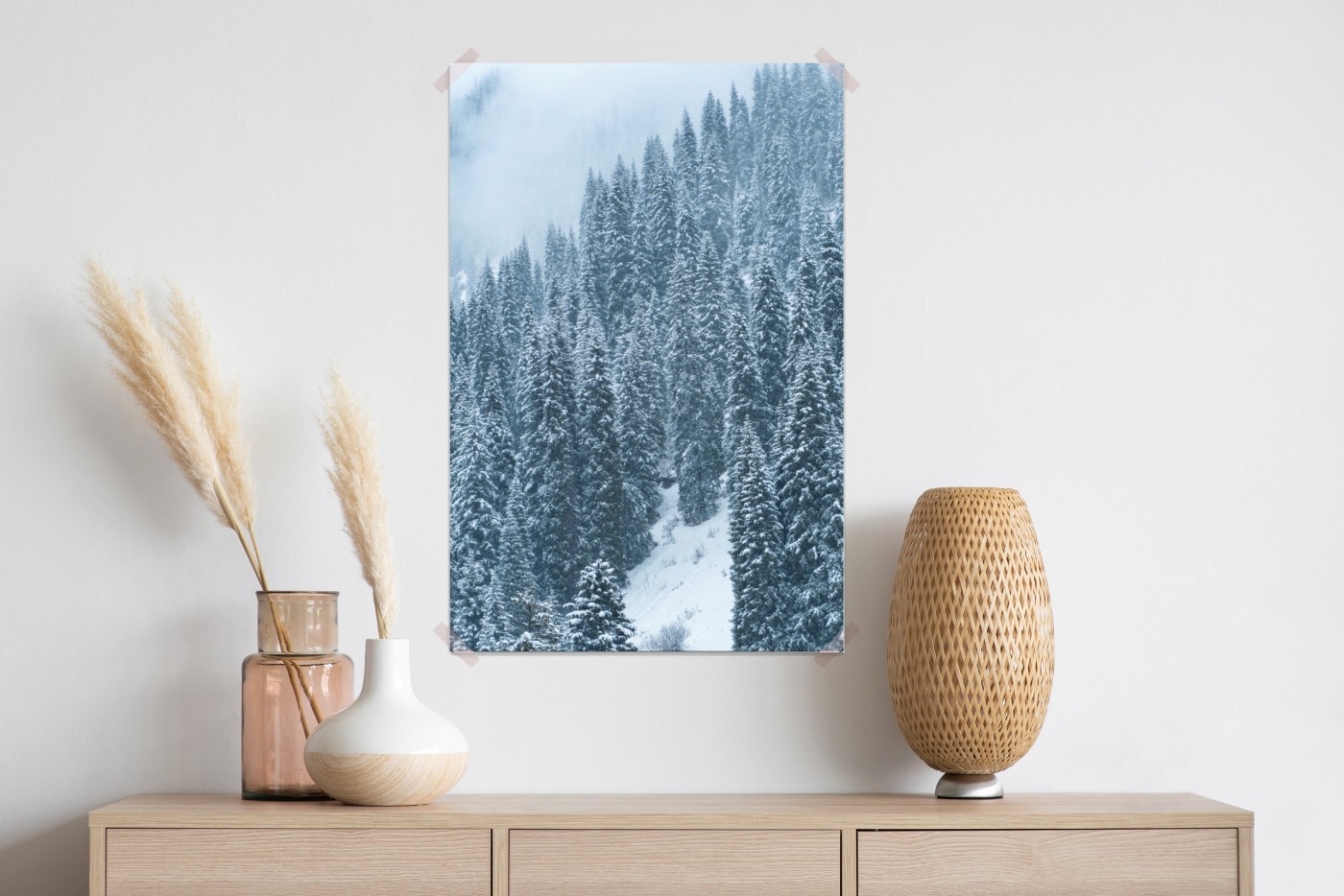 Bringen Sie ruhige Winterstimmung in Ihr Zuhause mit einem nebeligen, schneebedeckten Kiefernwald, der natürliche Schönheit ausstrahlt.MehrWeniger