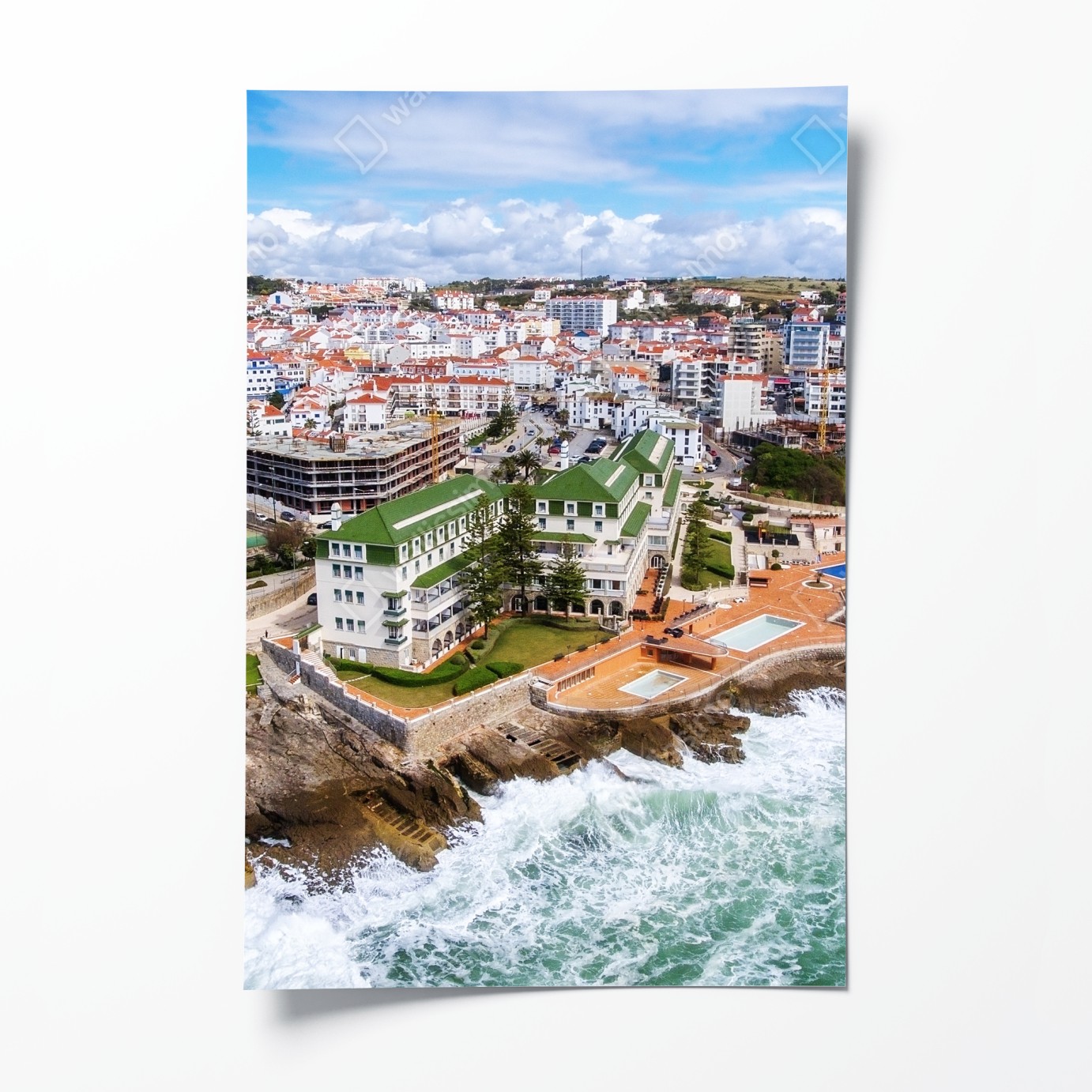 Poster Luftaufnahme einer küstenstadt mit tosenden wellen