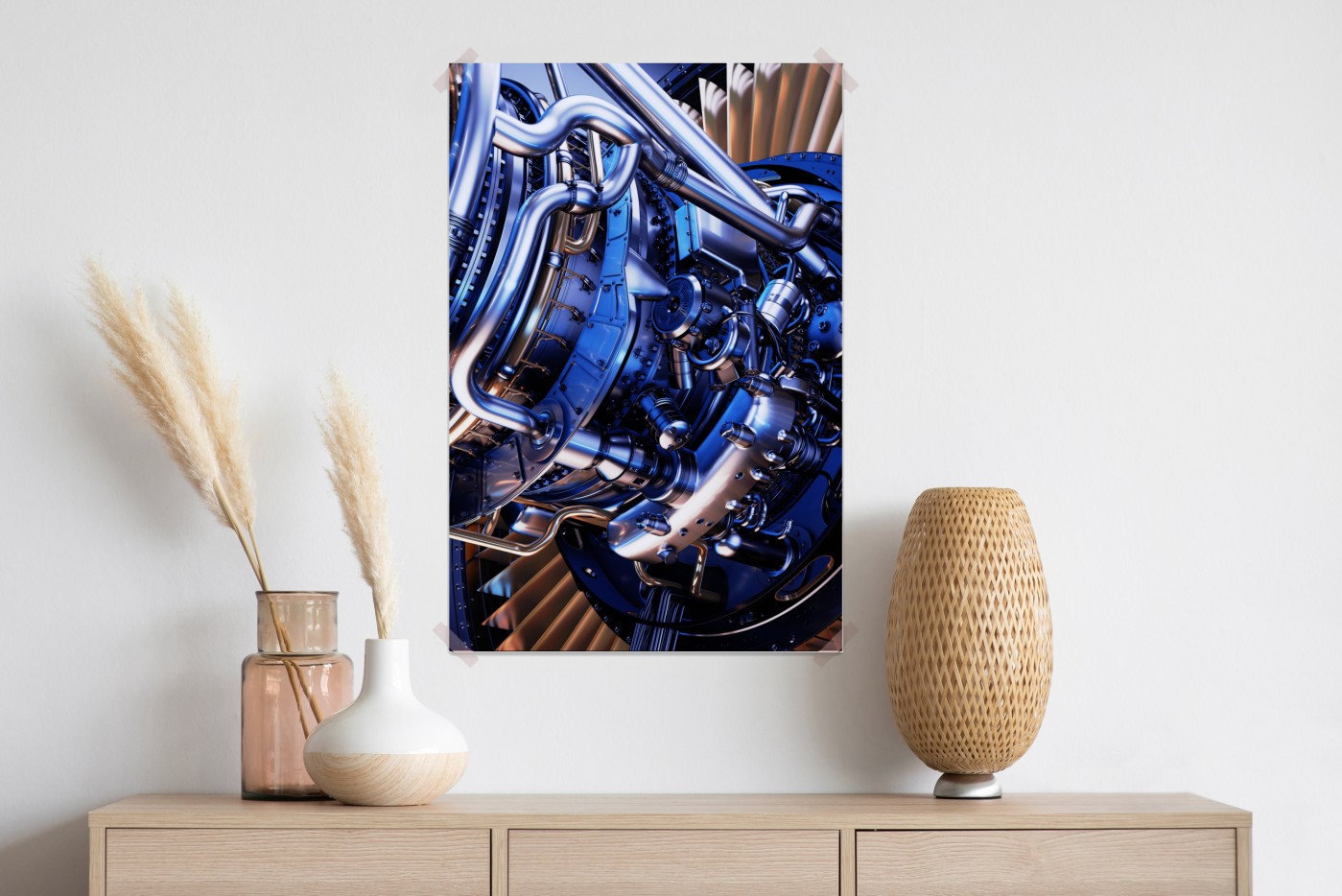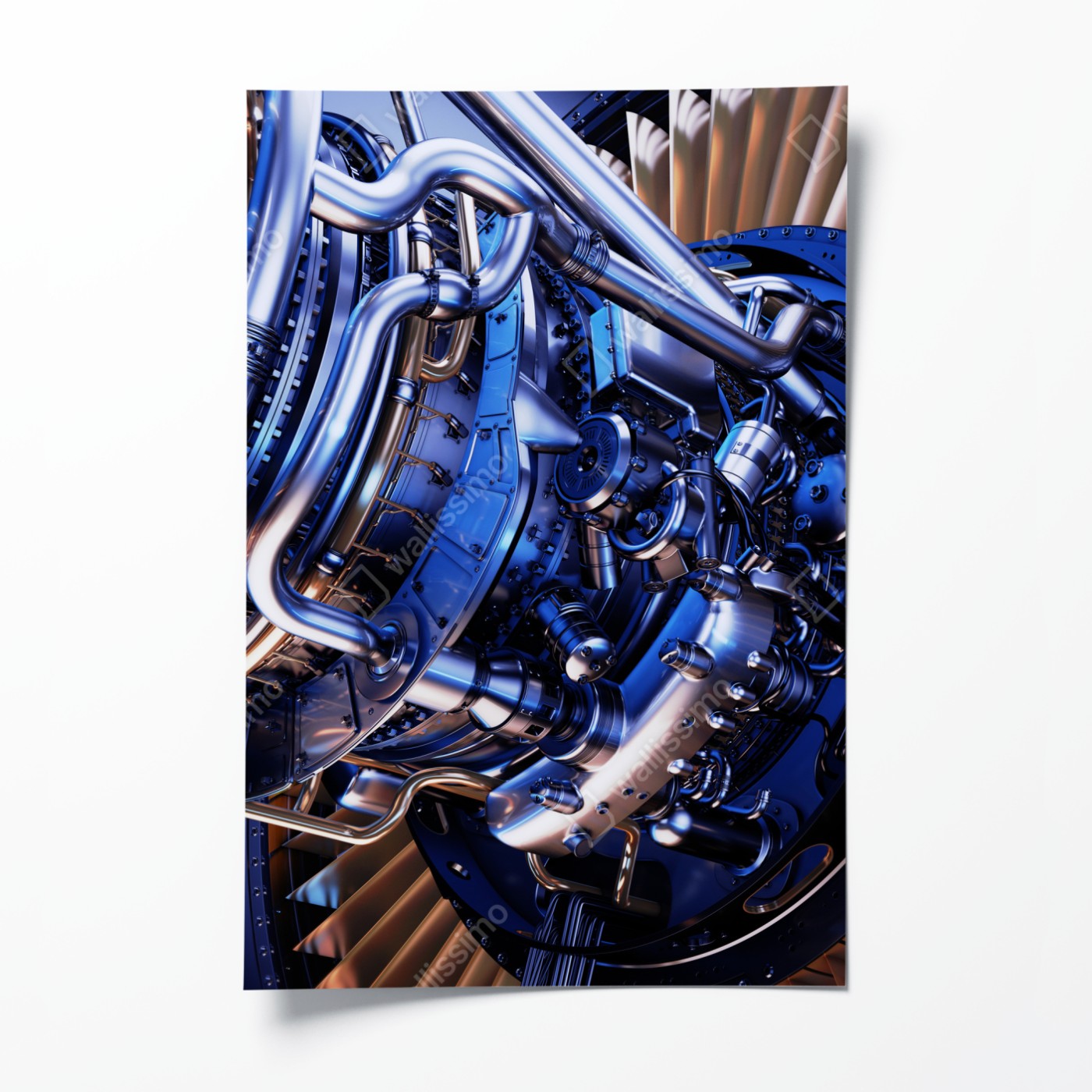 Poster Nahaufnahme einer turbinenanlage in blau und orange