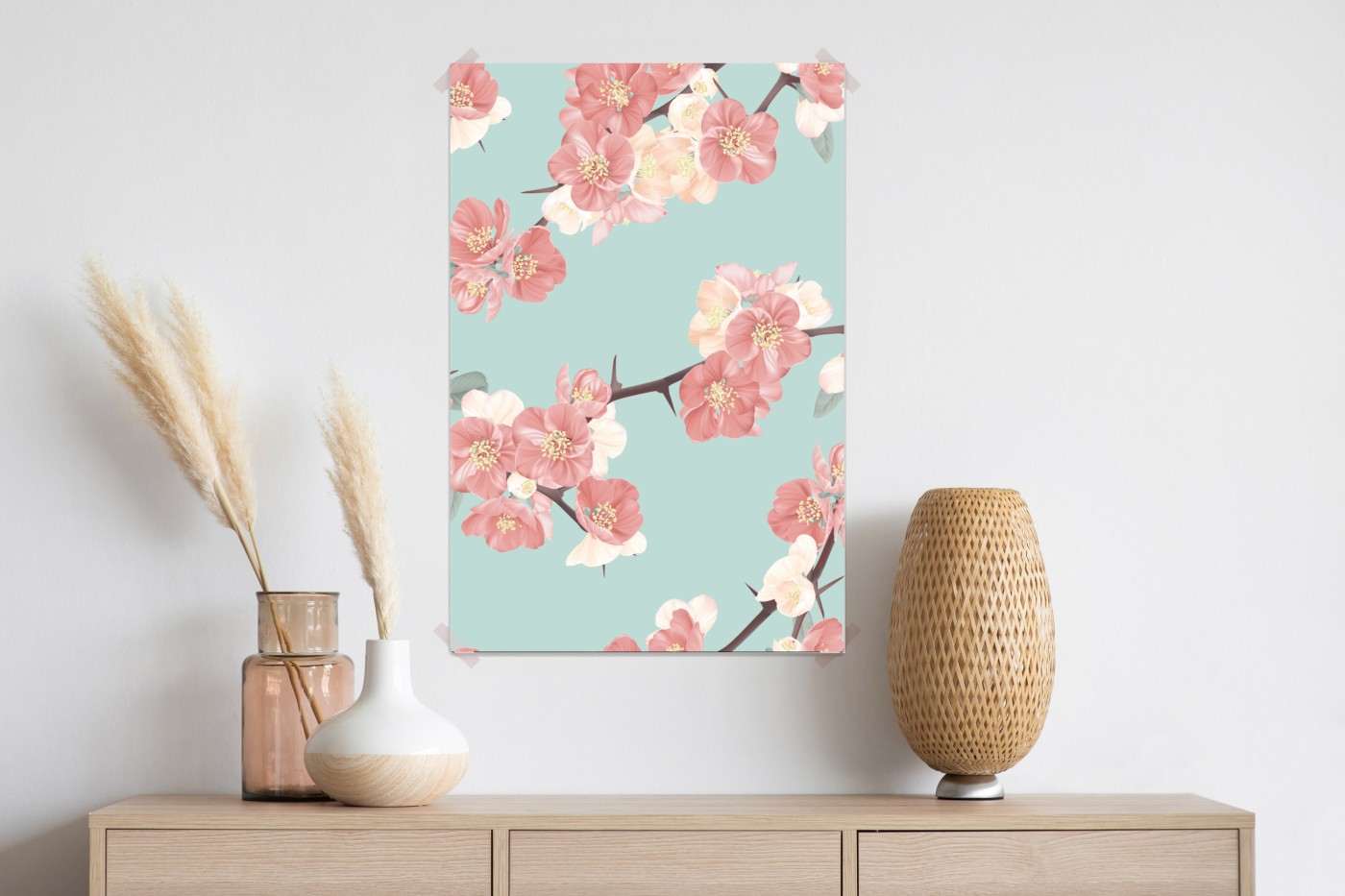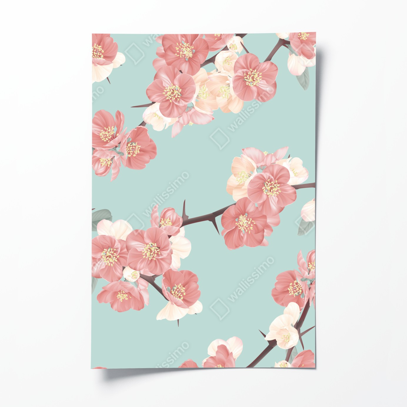 Poster Pastelliges kirschblütenmuster auf mintfarbenem hintergrund