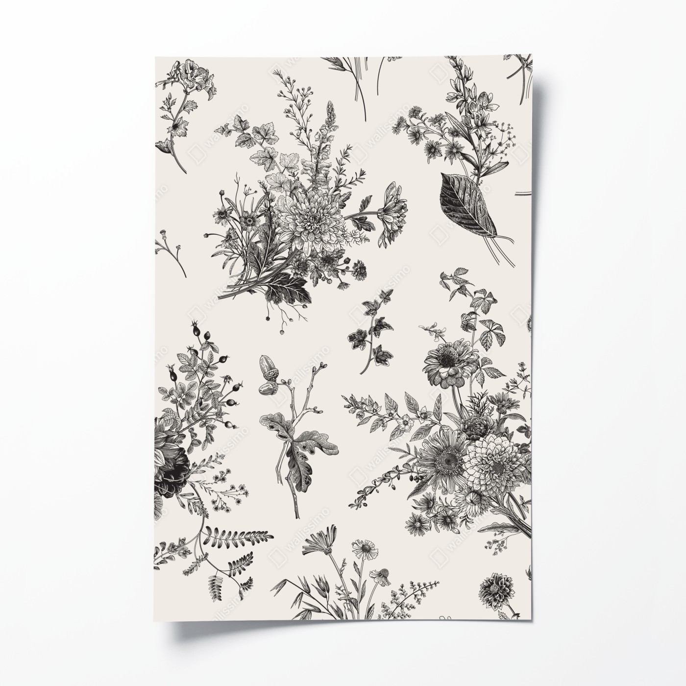 Verleihen Sie Ihren Wänden zeitlose Eleganz mit diesem detaillierten schwarzweißen Blumenmuster, ideal zur Schaffung einer stilvollen Retro-Atmosphäre.MehrWeniger