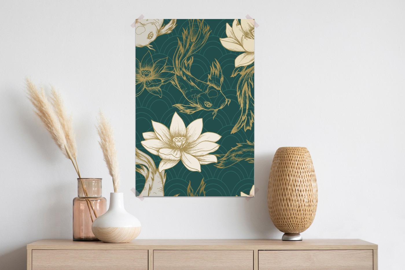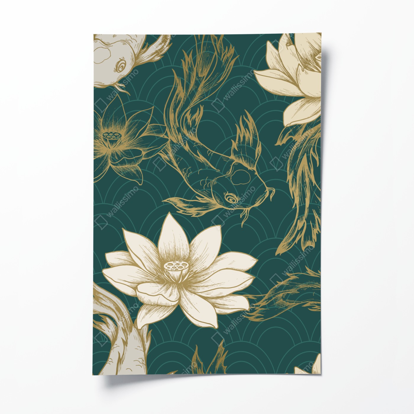 Poster Orientalisches koi- und lotosmuster in türkis und gold