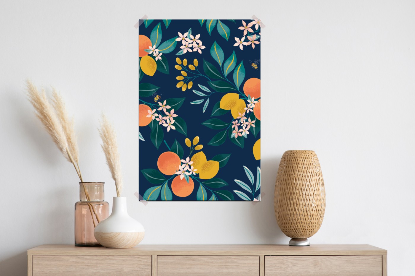Poster Botanisches zitronen- und orangenmuster auf marineblauem hintergrund