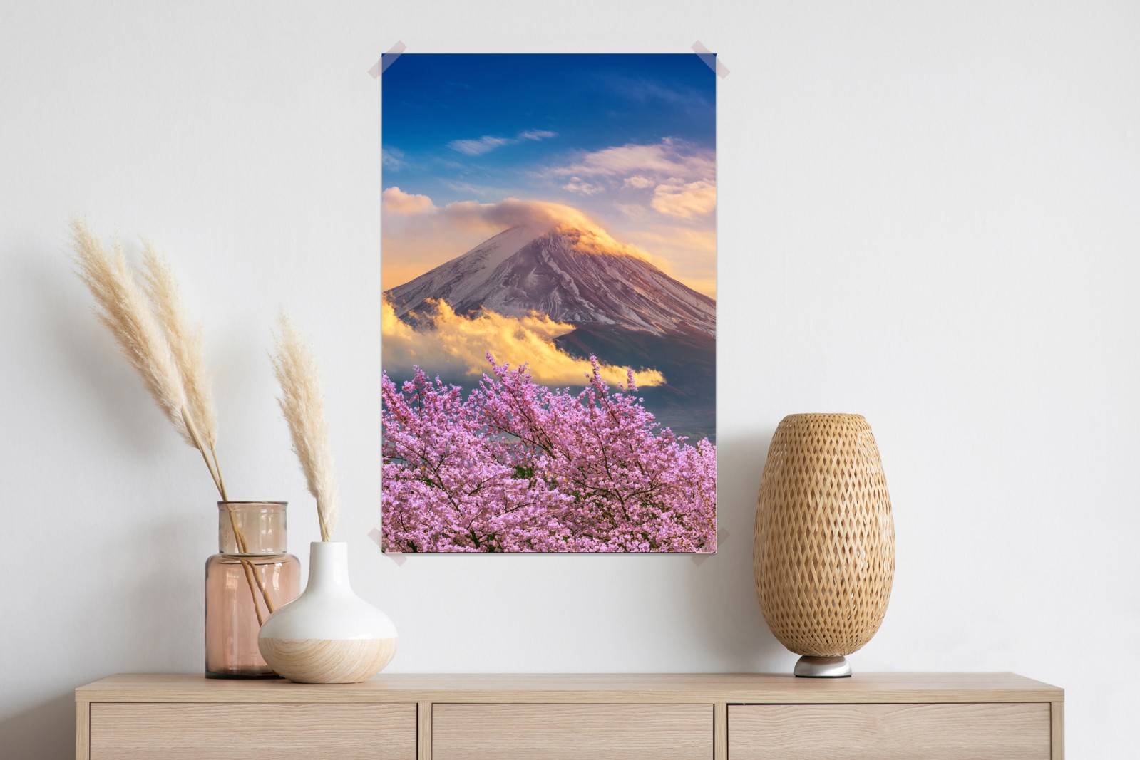 Poster Berg Fuji mit blühenden kirschblüten bei sonnenaufgang