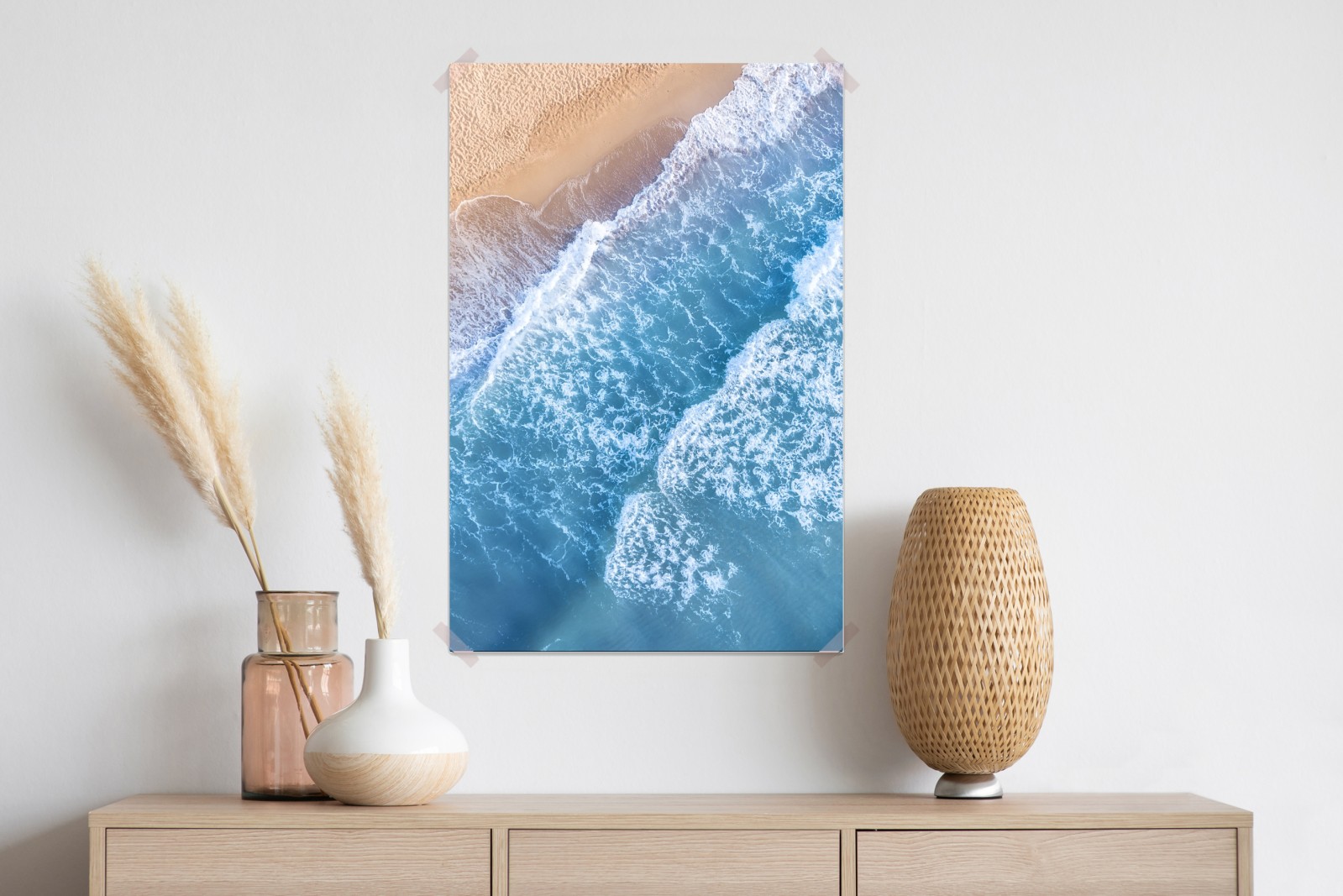 Beruhigende Luftaufnahme türkiser Wellen, die auf goldenen Sand treffen, ideal, um jedem Raum eine maritime Atmosphäre zu verleihen.