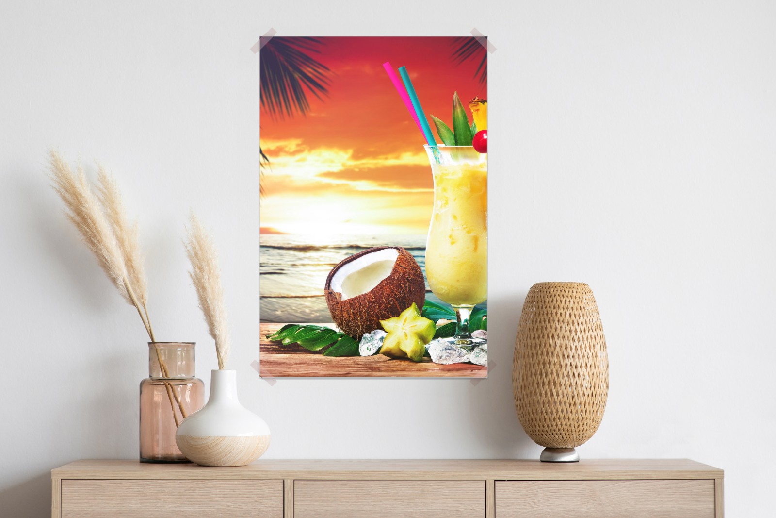 Lebendige tropische Szene mit erfrischendem Cocktail, frischer Ananas und Kokosnuss vor einem goldenen Strandsonnenuntergang, perfekt um sommerliches Flair in jeden Raum zu bringen.