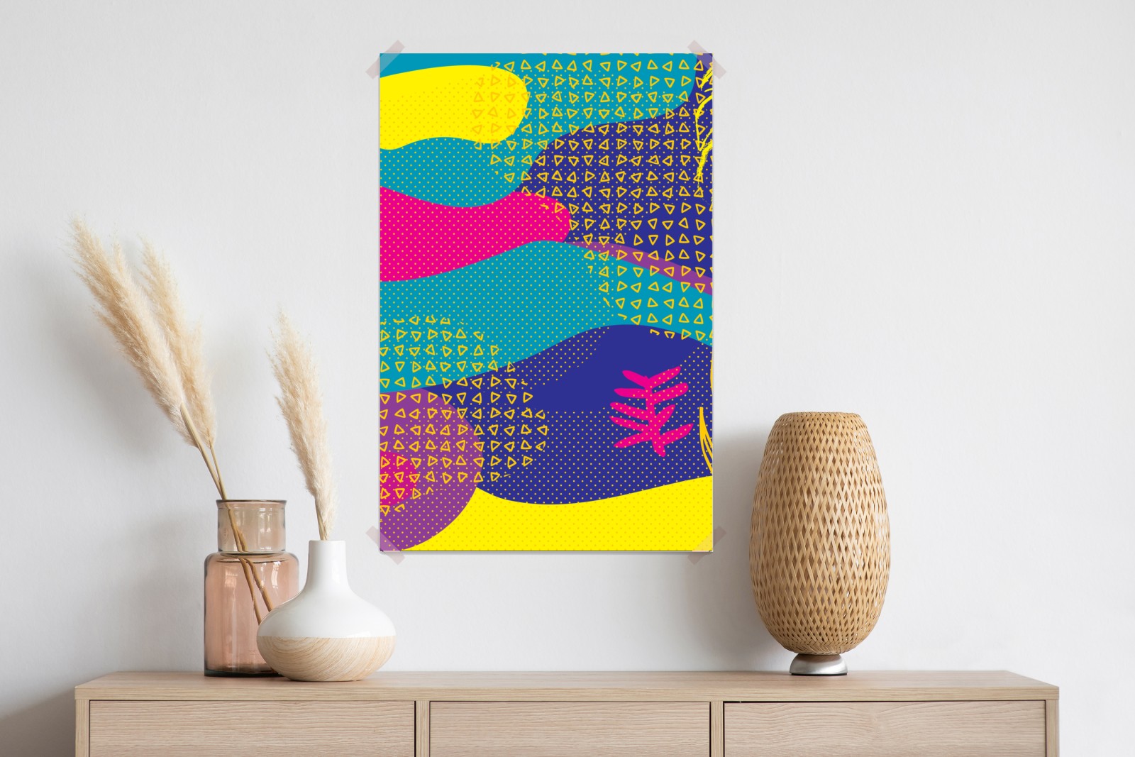 Kräftige, bunte abstrakte Grafik mit tropischen Formen und geometrischen Mustern, die jedem Raum lebendige Akzente verleiht.