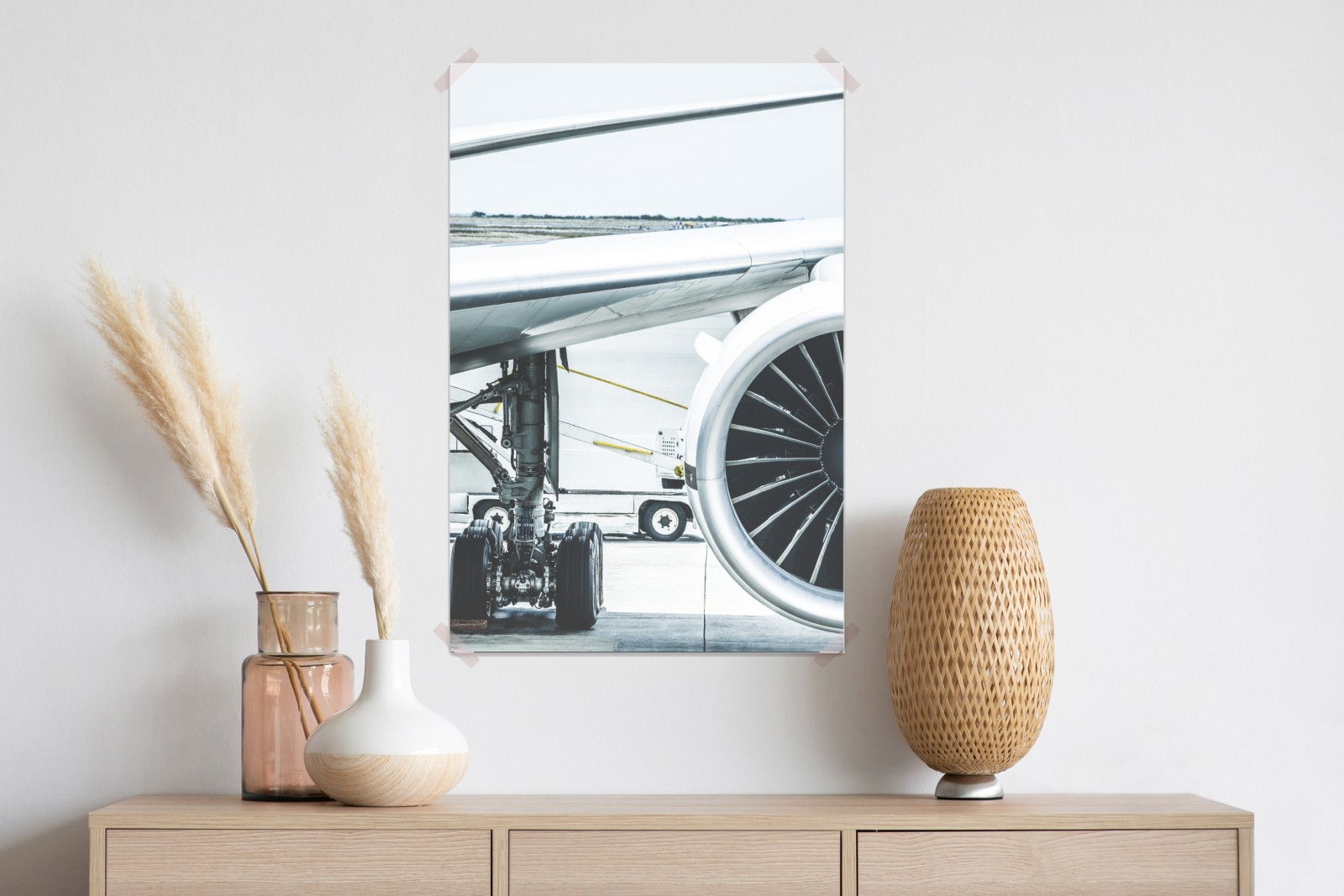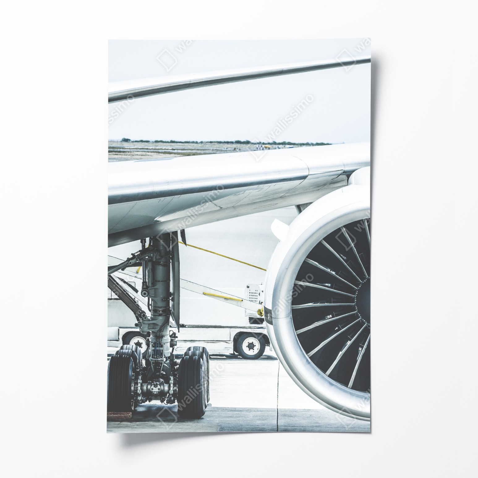 Markante Nahaufnahme eines Flugzeugtriebwerks und Flügels am Flughafen, die die Vorfreude auf das Reisen in kühlen Retro-Tönen einfängt.