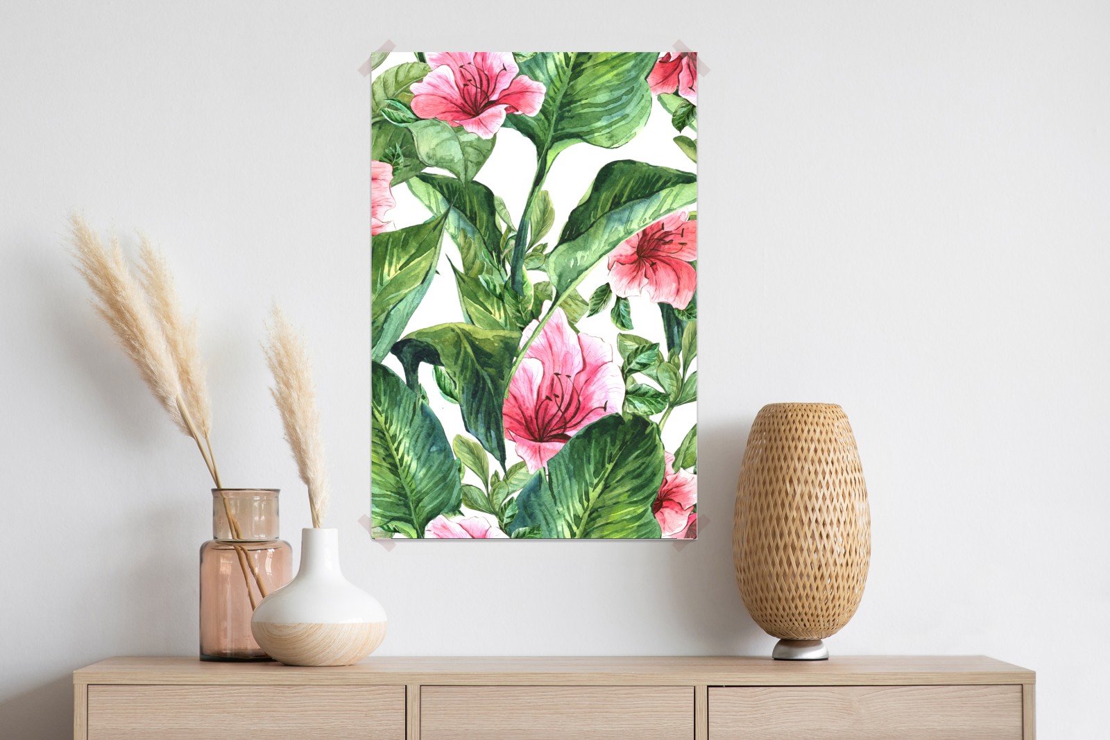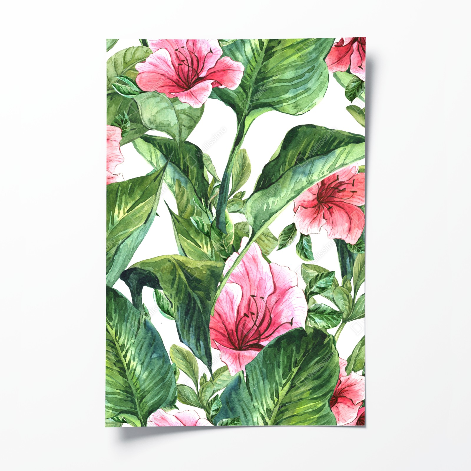 Eine zarte Aquarellkomposition aus rosa Blüten und üppigen grünen Blättern, die jedem Raum einen beruhigenden botanischen Akzent verleiht.