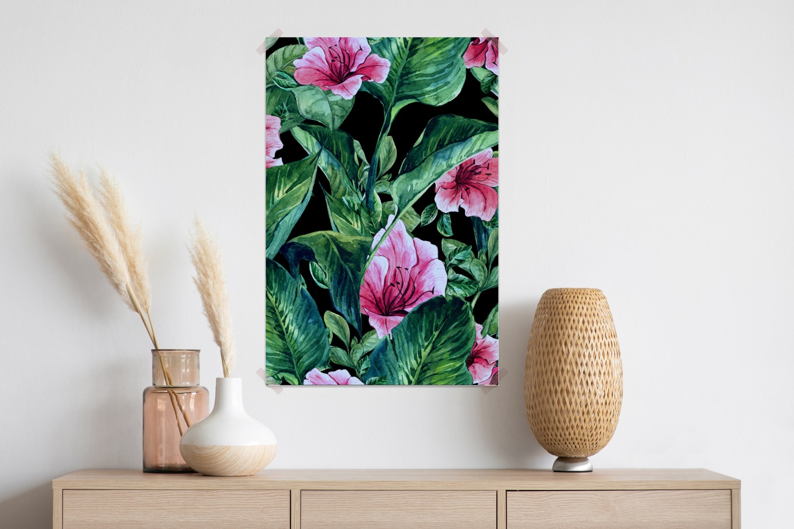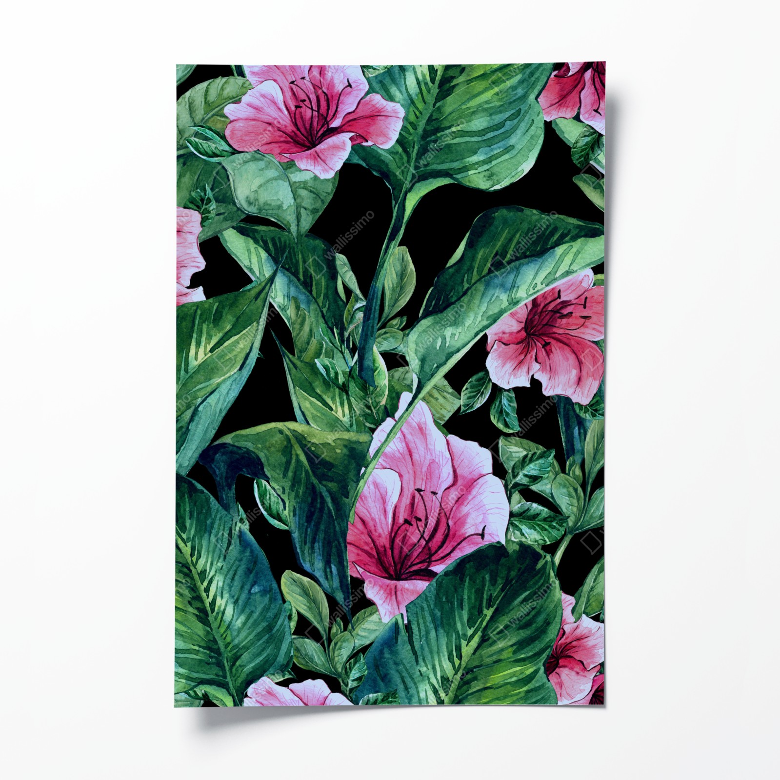 leuchtende rosa aquarellblumen und üppige grüne blätter schaffen ein kräftiges botanisches design auf tiefschwarzem hintergrund und verleihen jedem interieur natürliche eleganz und dramatischen kontrast.