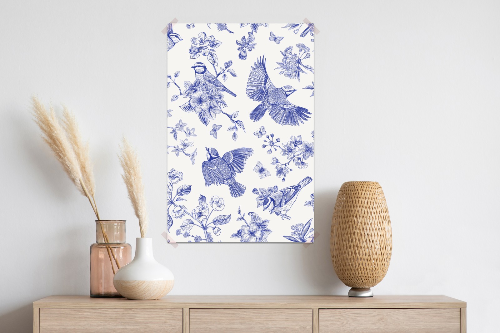 Poster blaues muster mit vögeln und blüten im vintage-stil – Wallnifity®