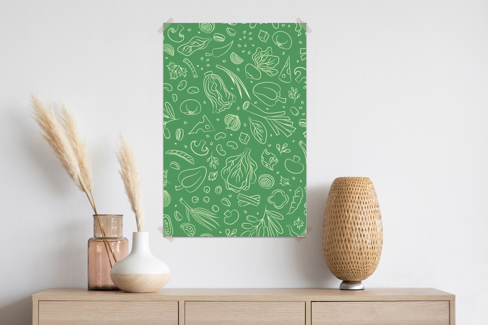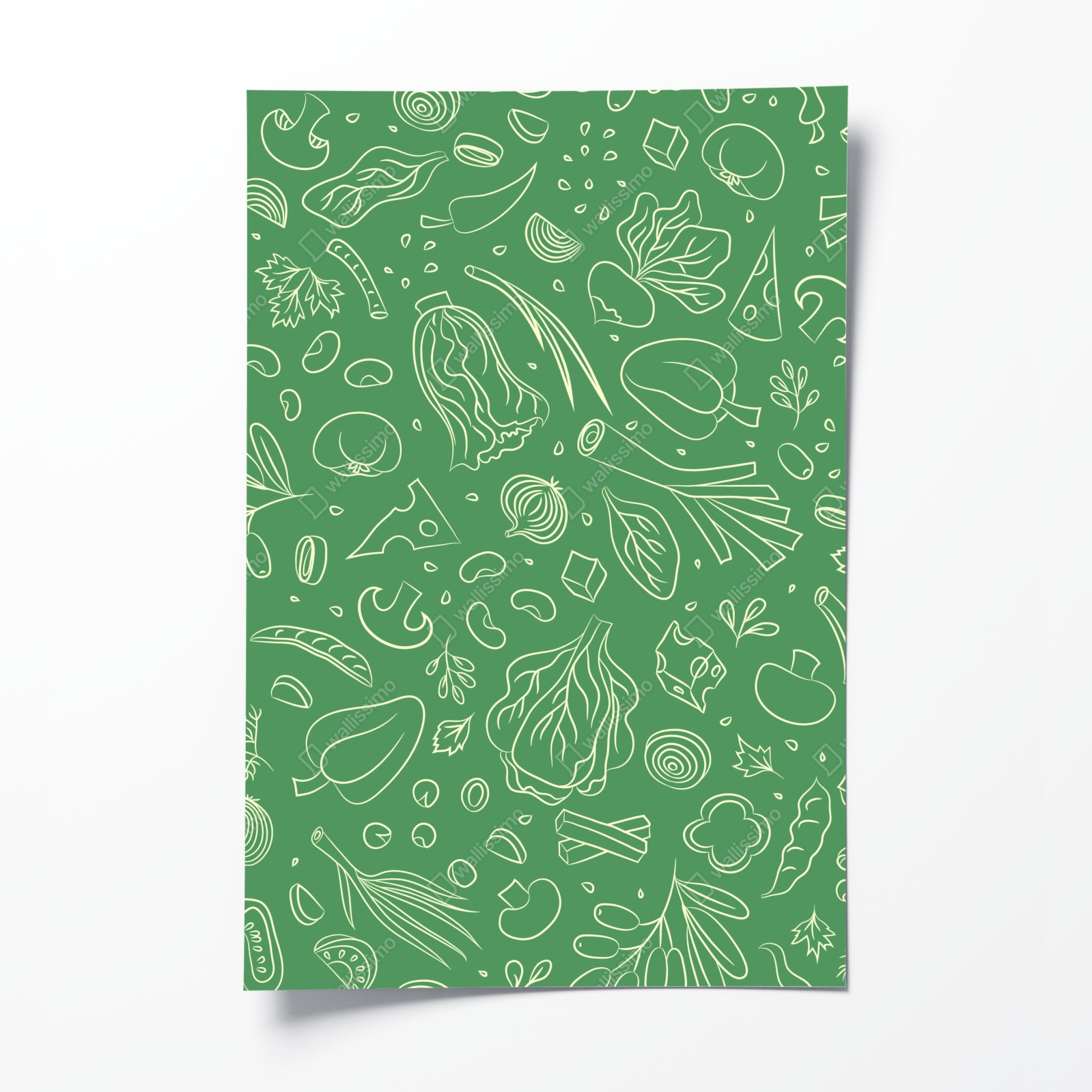 Verleihen Sie Ihrer Küche mit diesem handgezeichneten Gemüsemotiv in Grün einen frischen, minimalistischen Look, ideal für kulinarisch inspirierte Wohnräume.