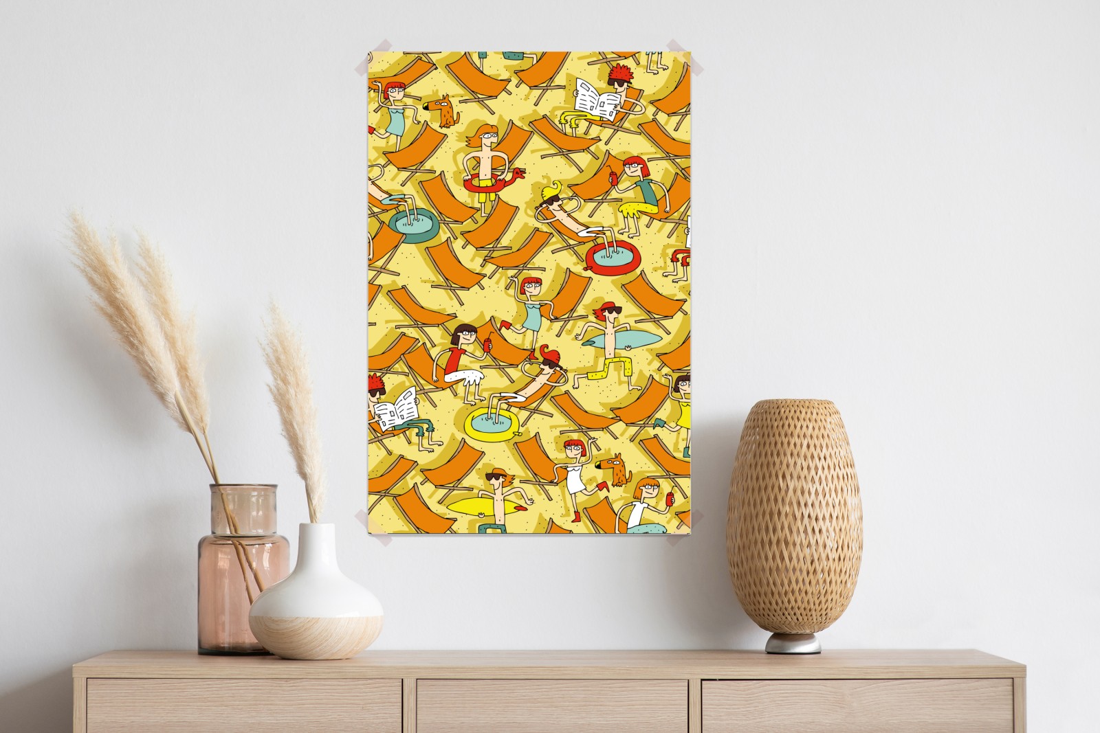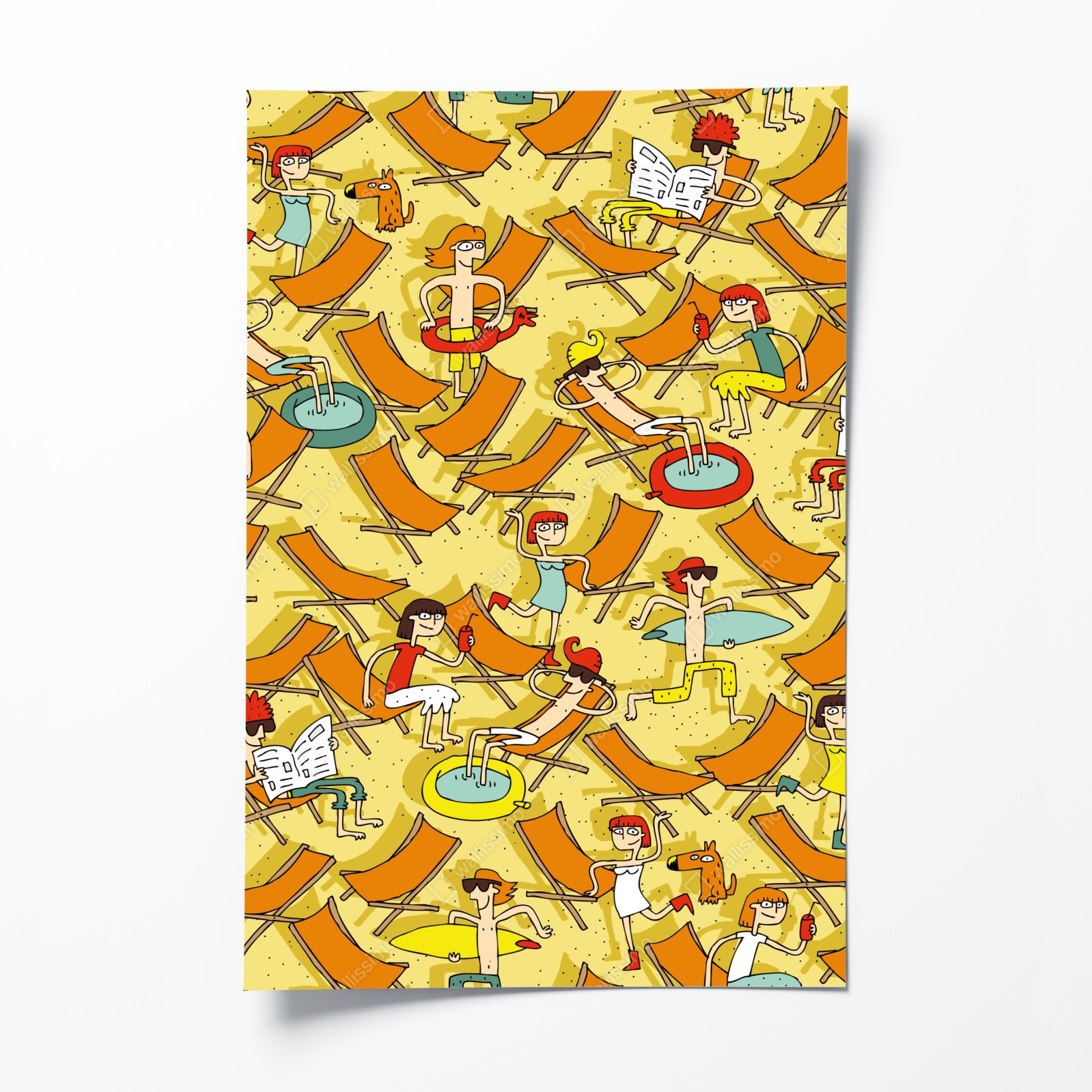 Helles, verspieltes Strandmuster mit Sonnenbadenden, Liegestühlen und sommerlicher Stimmung — perfekt, um jedem Raum eine fröhliche Note zu verleihen.