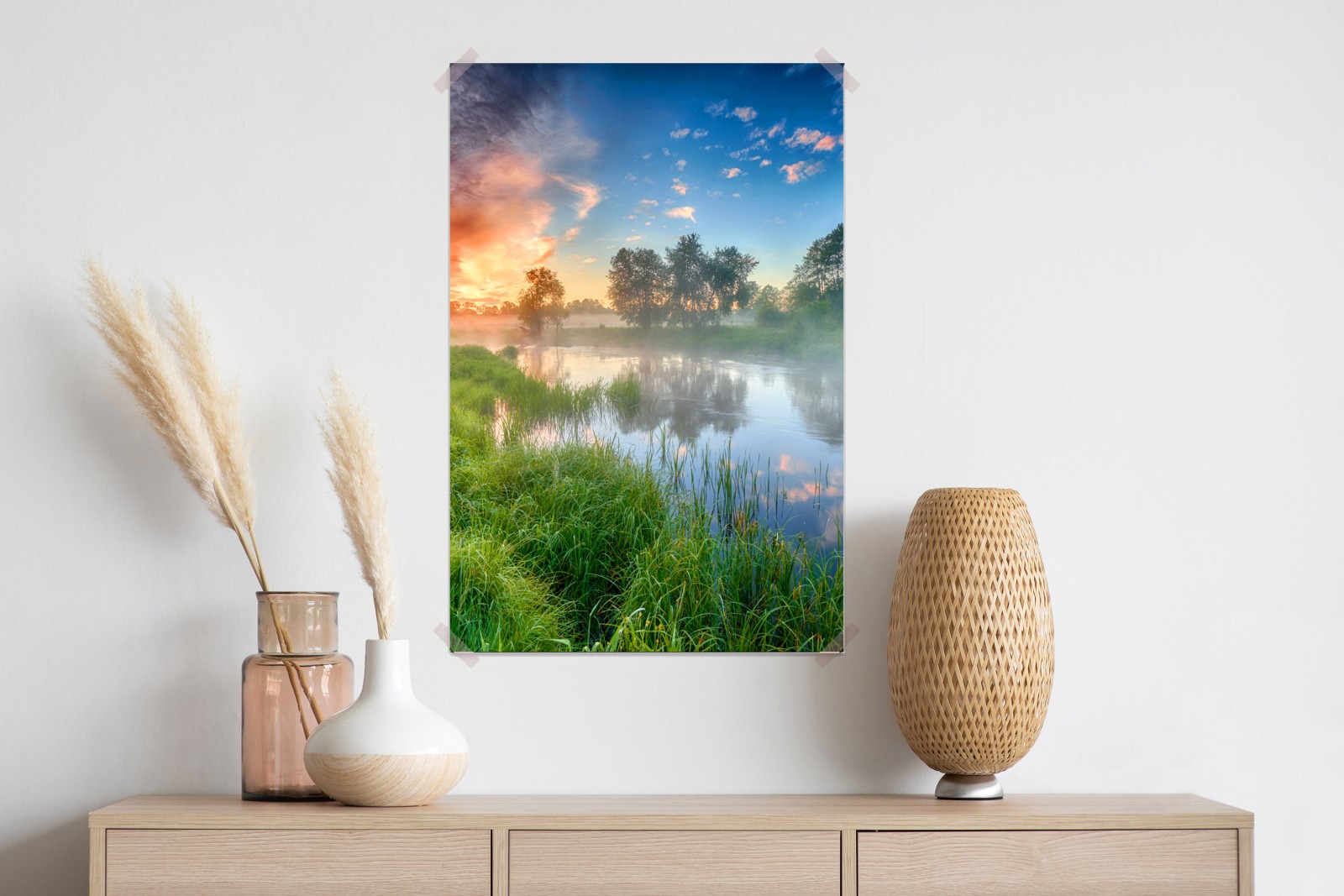 Poster nebel bei sonnenaufgang am flussufer – Wallnifity®