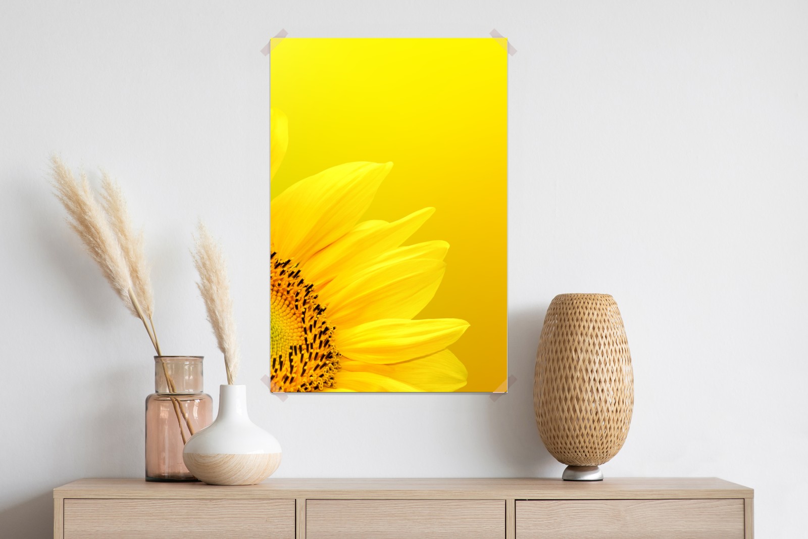 Poster Leuchtende sonnenblume nahaufnahme auf gelbem hintergrund