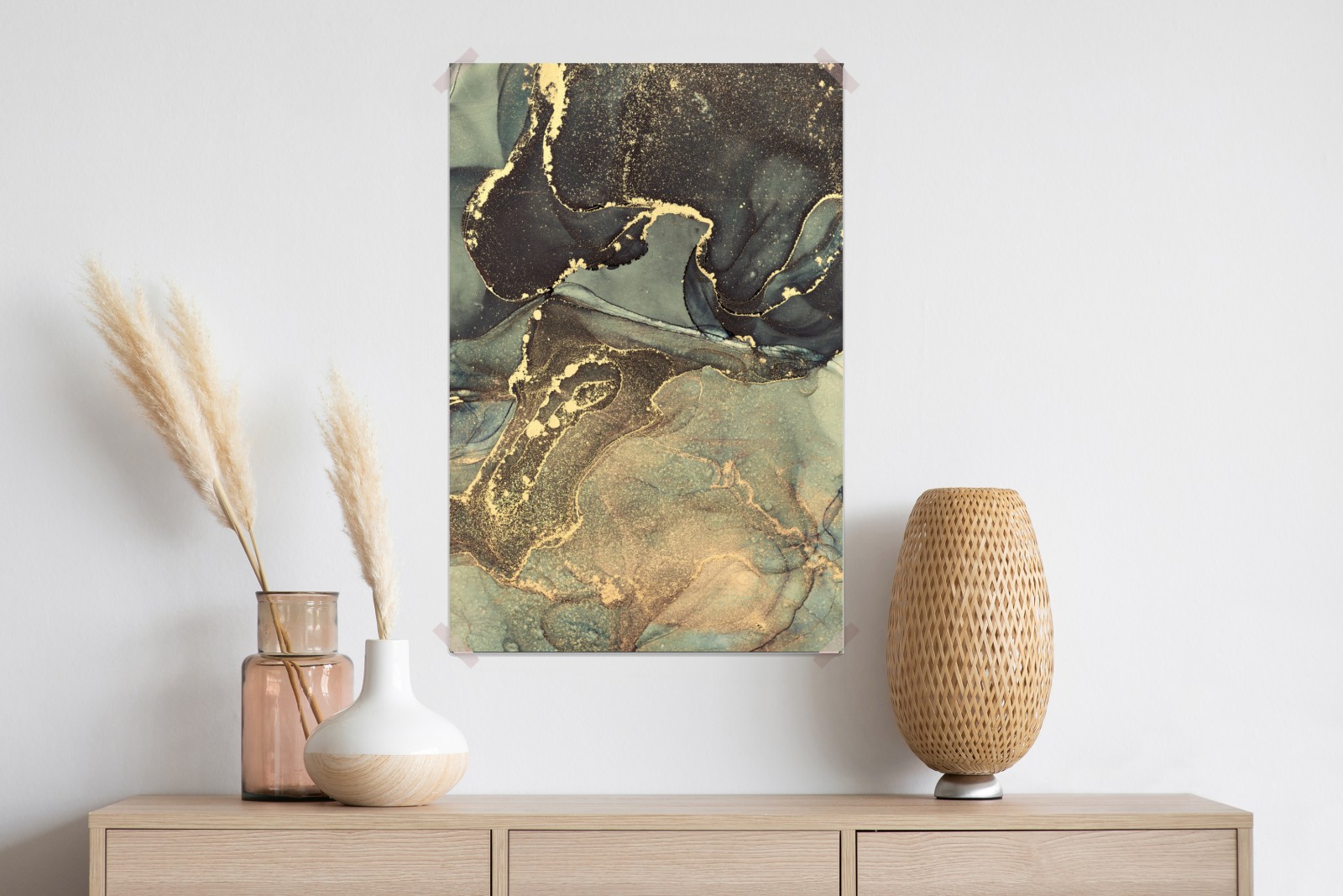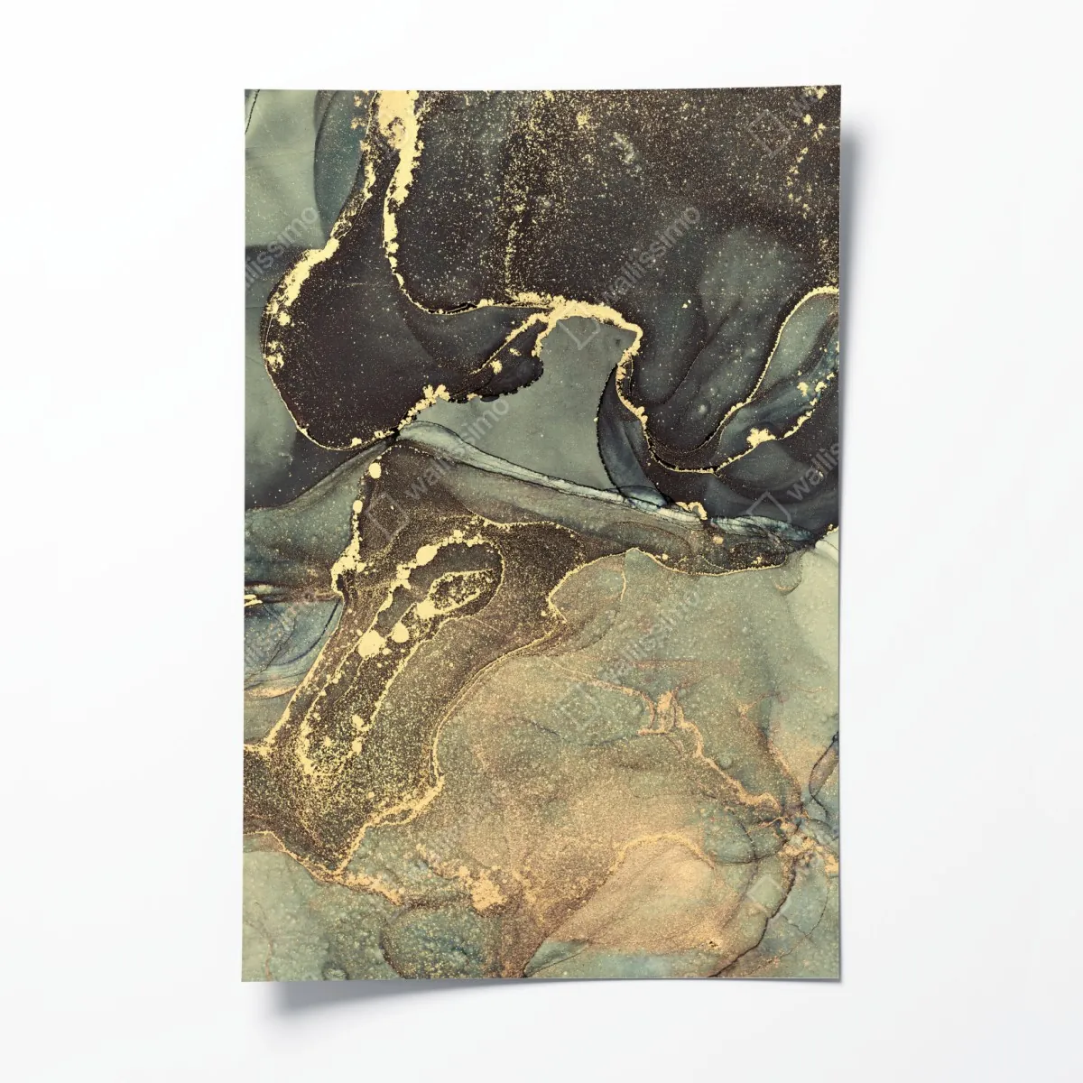 Elegante türkis-goldene fließende abstraktion mit schimmernden akzenten verleiht modernen räumen einen luxuriösen, verträumten touch.
