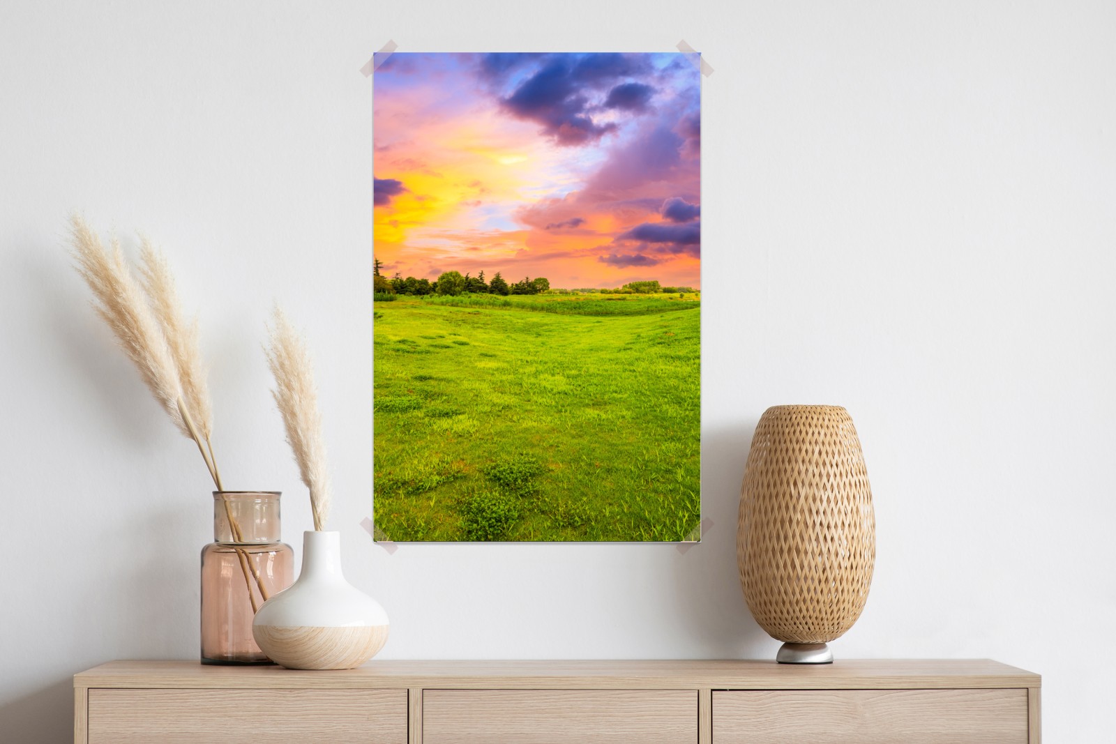Ein leuchtender Sonnenuntergang über einer üppigen grünen Wiese bringt Wärme und Ruhe in jeden Raum.