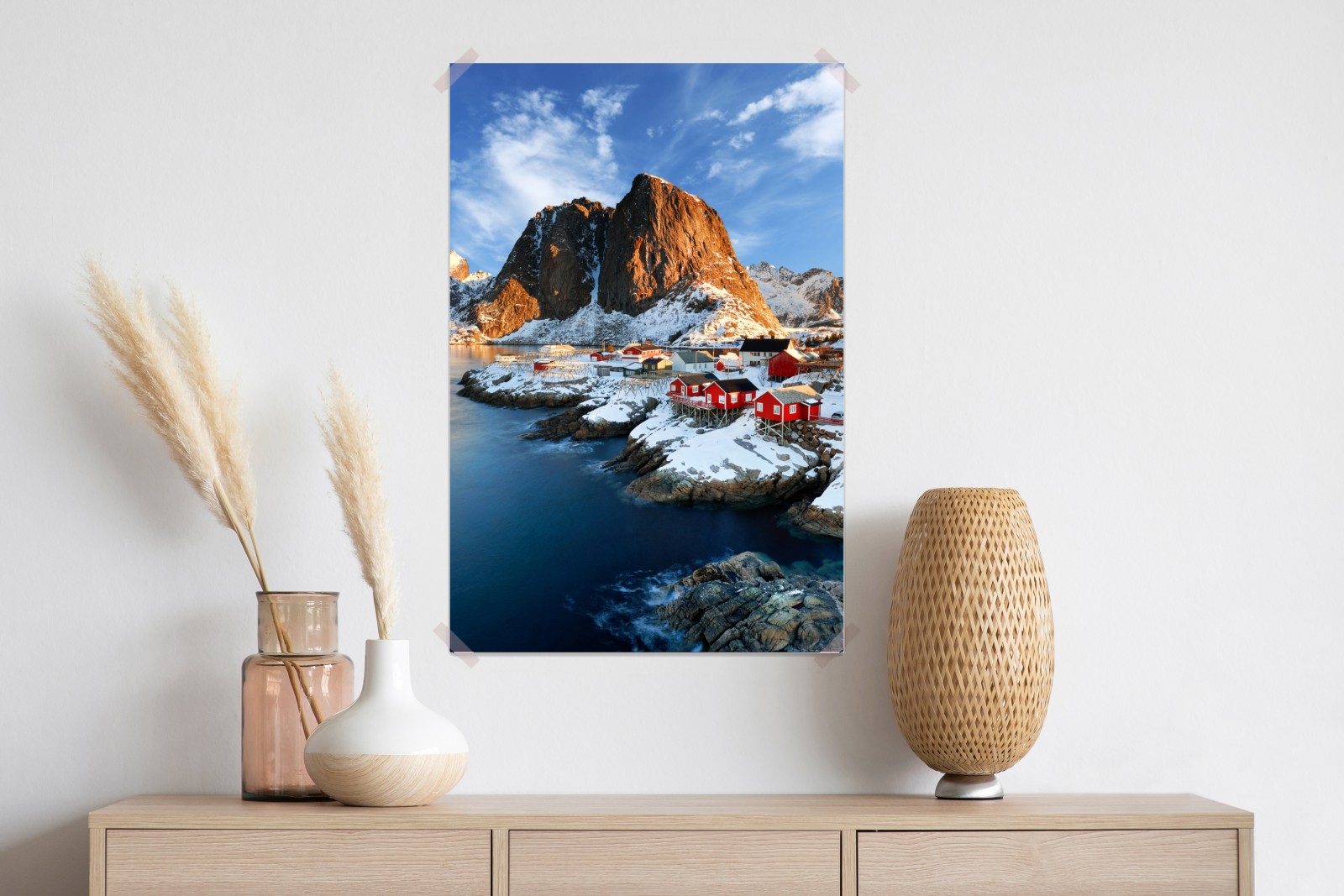 beeindruckender ausblick auf schneebedeckte berge und rote fischerhütten an der küste von Hamnøy, ideal um nordische ruhe und natur in ihr zuhause zu bringen.