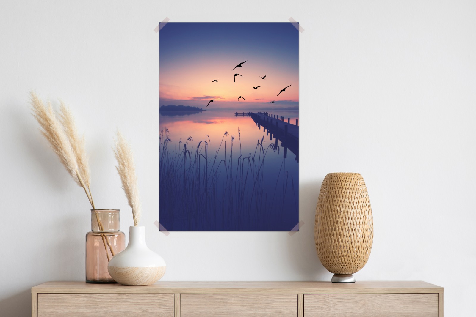 Poster Ruhiger sonnenaufgang am see mit vögeln