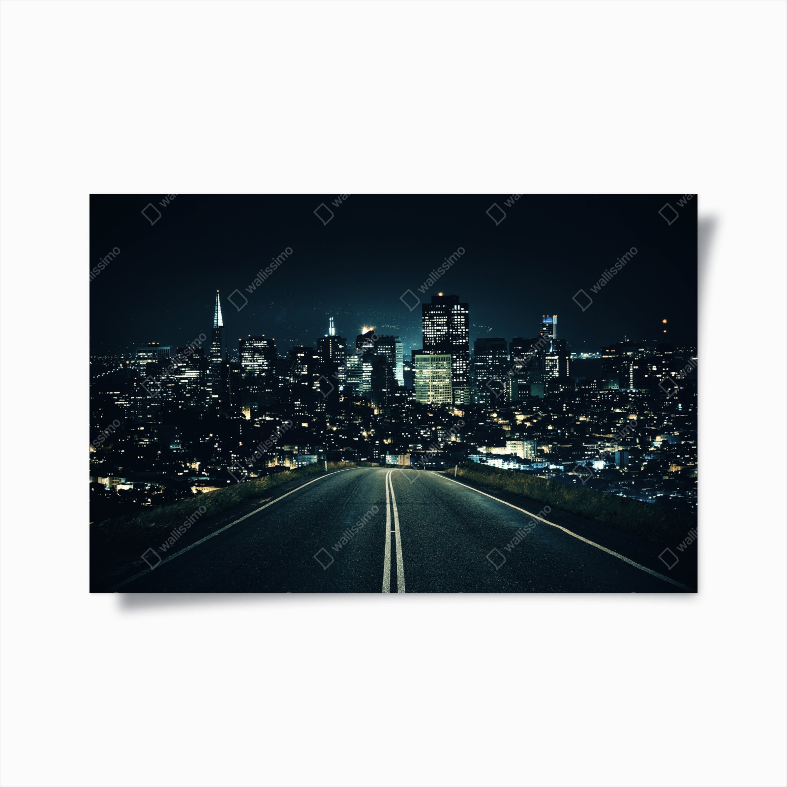 Poster Straße zur beleuchteten stadtsilhouette bei nacht