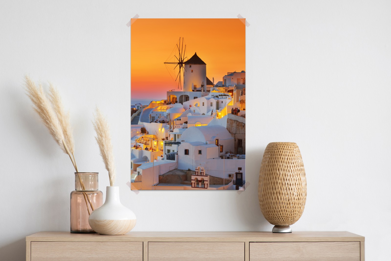 Ein warmer, goldener Sonnenuntergang taucht die ikonischen weißen Häuser und Windmühlen von Oia auf Santorini in ein ruhiges, mediterranes Licht und schafft eine perfekte Stimmung für jedes Wohnzimmer.