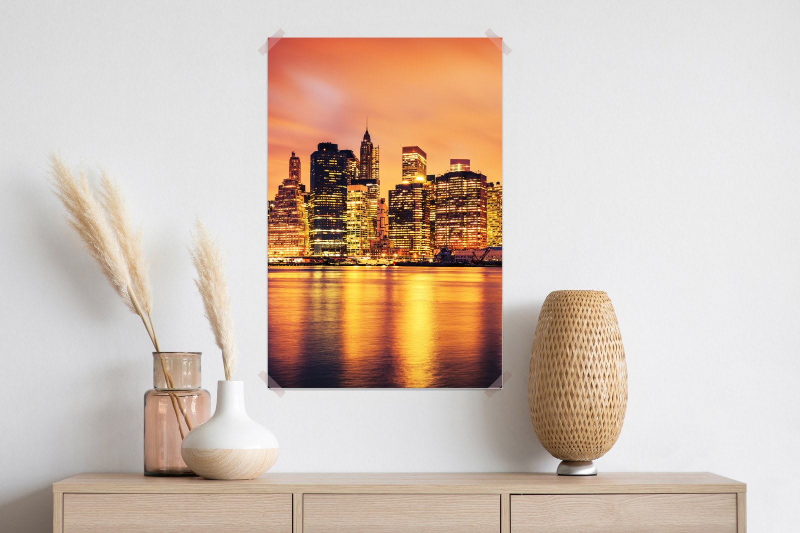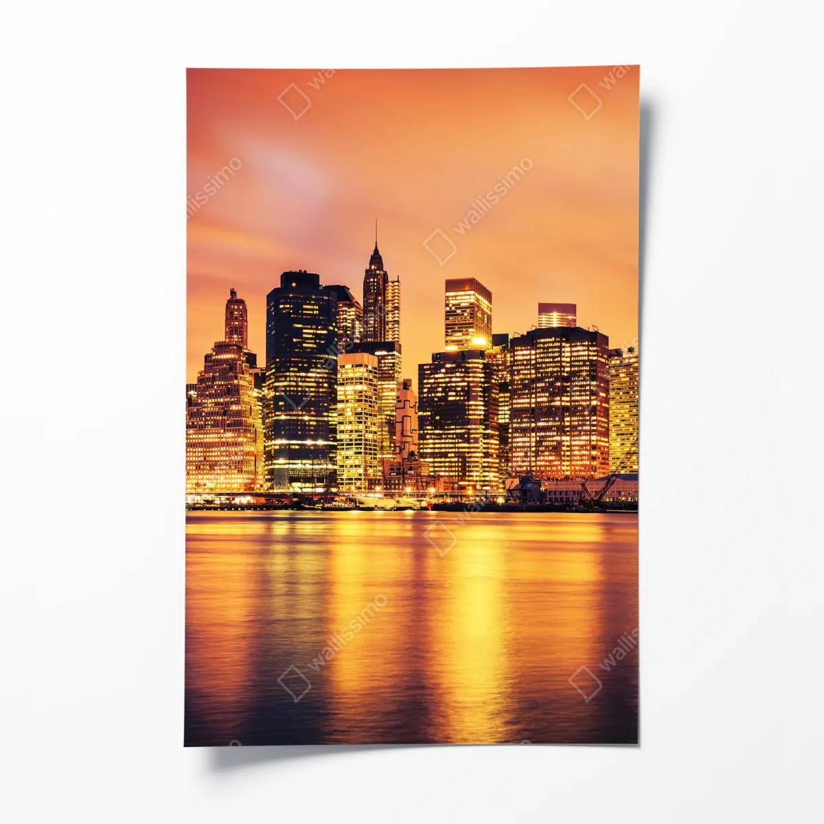 Dramatische New York-Skyline bei Sonnenuntergang in warmen Goldtönen, perfekt, um Räumen urbanen Charme zu verleihen.