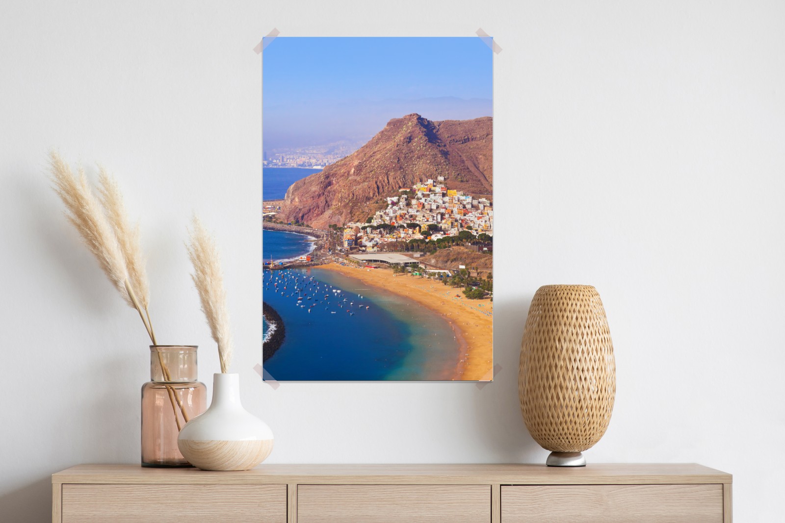 Bringen Sie die ruhige Küste von Playa de Las Teresitas in Ihr Zuhause mit diesem lebendigen Küstenfoto, ideal für eine entspannte Atmosphäre.