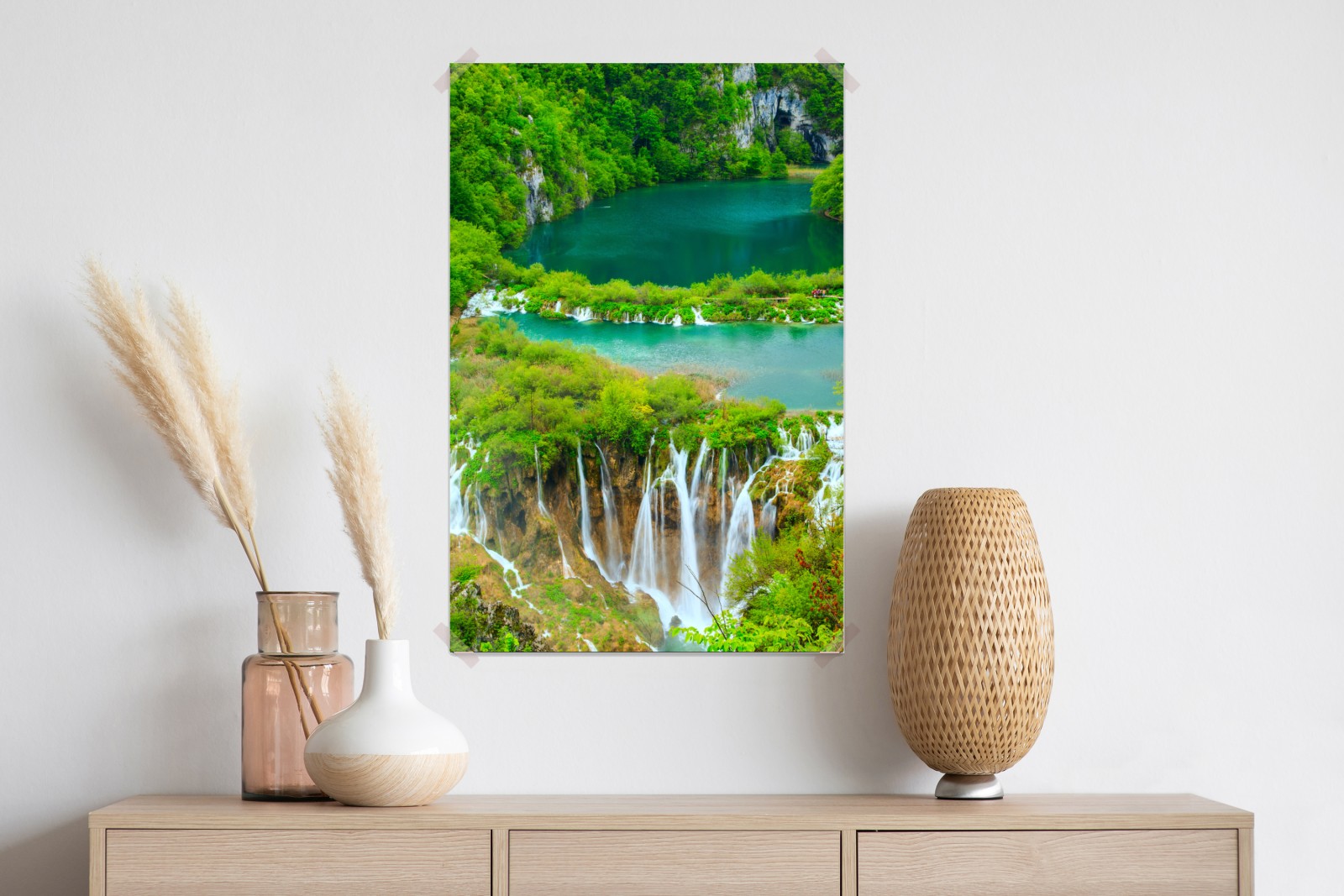Bringen Sie die beruhigende Energie smaragdgrüner Wälder und stürzender Wasserfälle mit diesem lebendigen Naturmotiv in Ihren Raum, ideal als harmonischer Blickfang.
