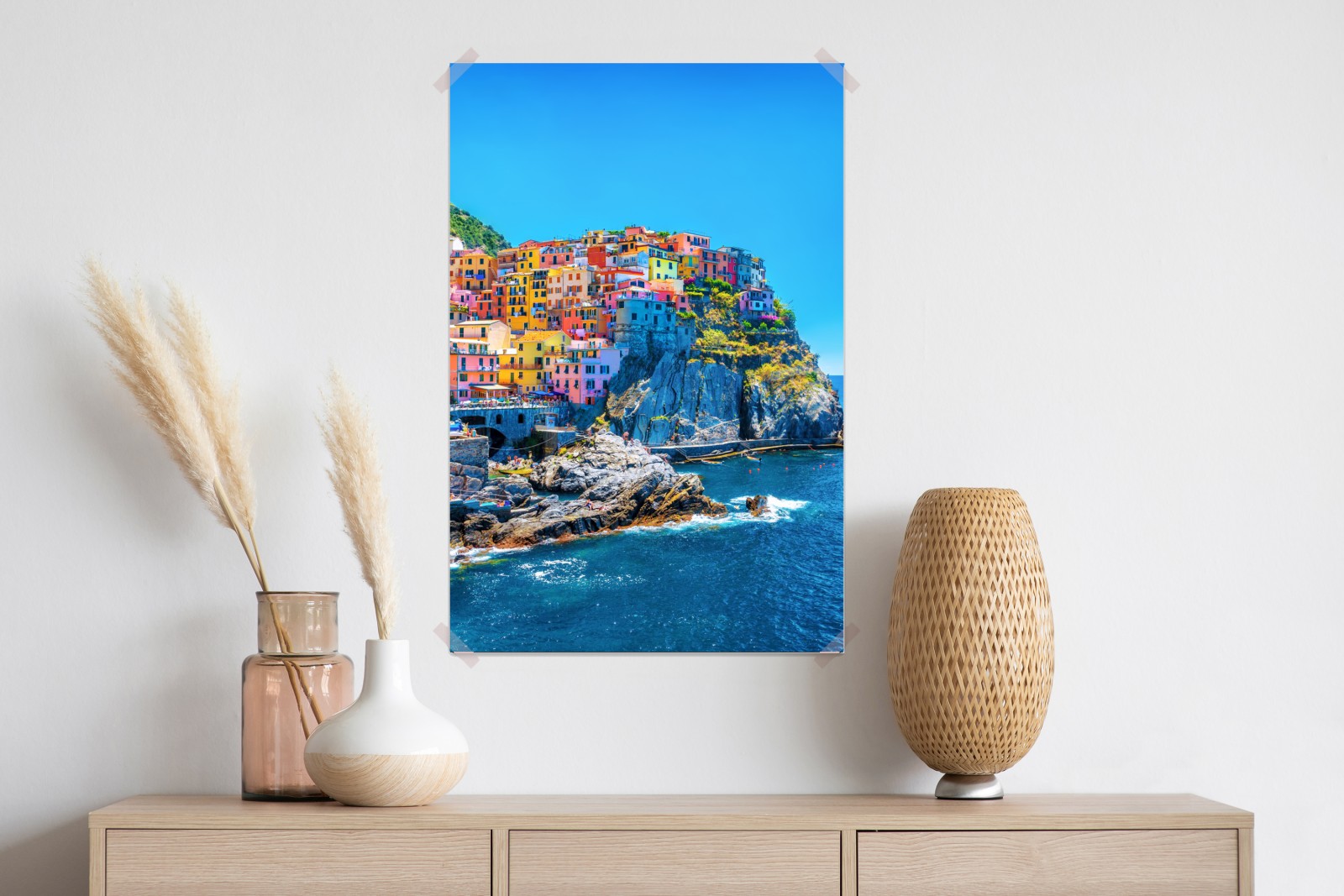 Lebendige Panoramaufnahme eines bunten Küstendorfs auf steilen Klippen, die sonnige Reiseatmosphäre und kräftige Farben in ihr Interieur bringt.