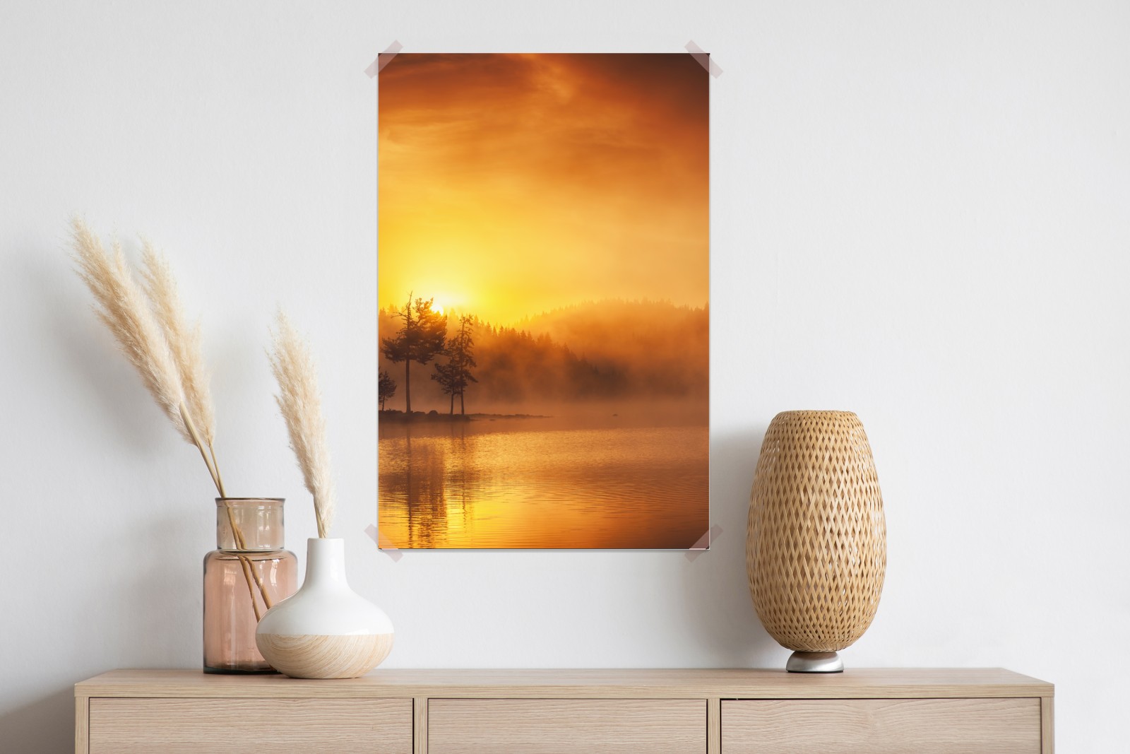 Ein friedlicher goldener Sonnenaufgang über einem nebligen See bringt Wärme und Ruhe in jeden Raum.