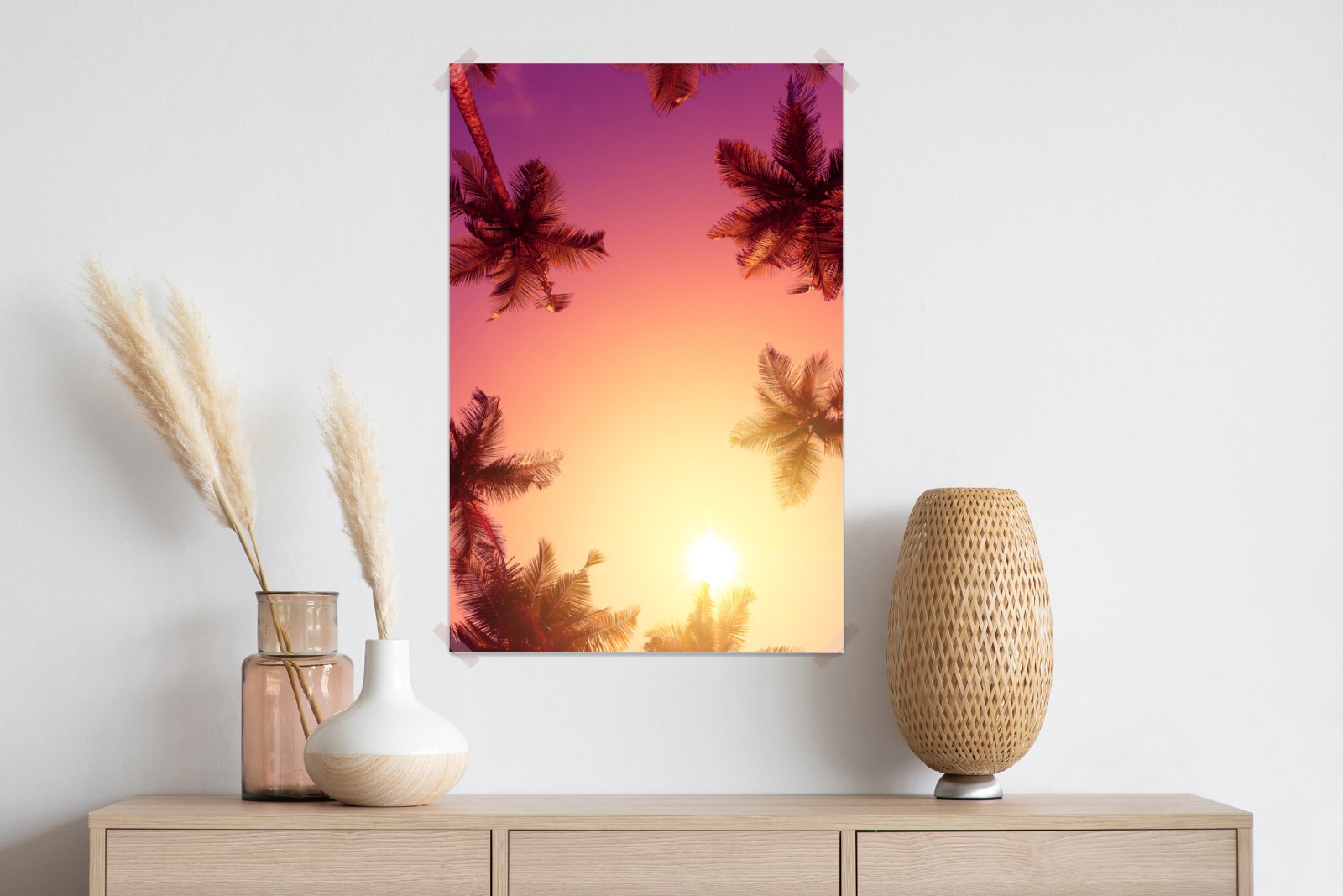 Bringen Sie Inselstimmung in Ihr Zuhause mit diesem lebendigen tropischen Sonnenuntergang mit Palmen-Silhouetten und warmen Farbtönen.