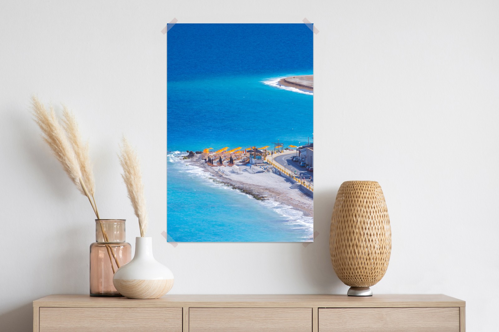 Bringen Sie das leuchtende Blau von Rhodos in Ihr Zuhause mit diesem ruhigen Küstenmotiv, das türkisfarbenes Wasser und sonnige Sonnenschirme zeigt.