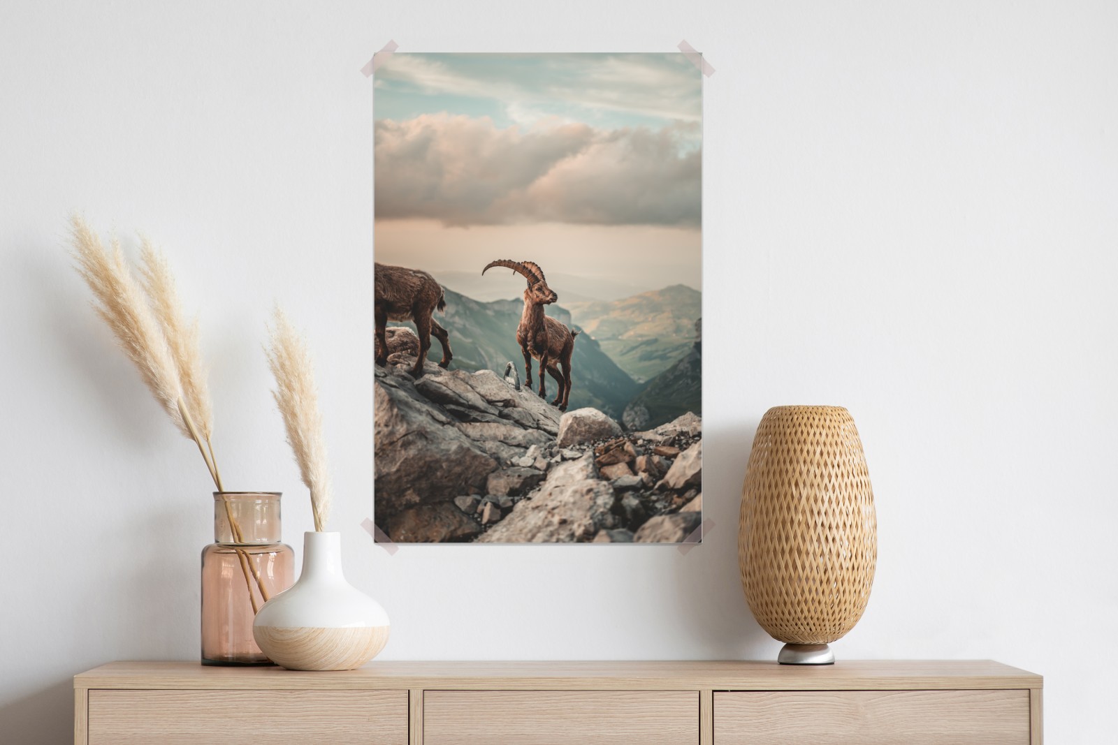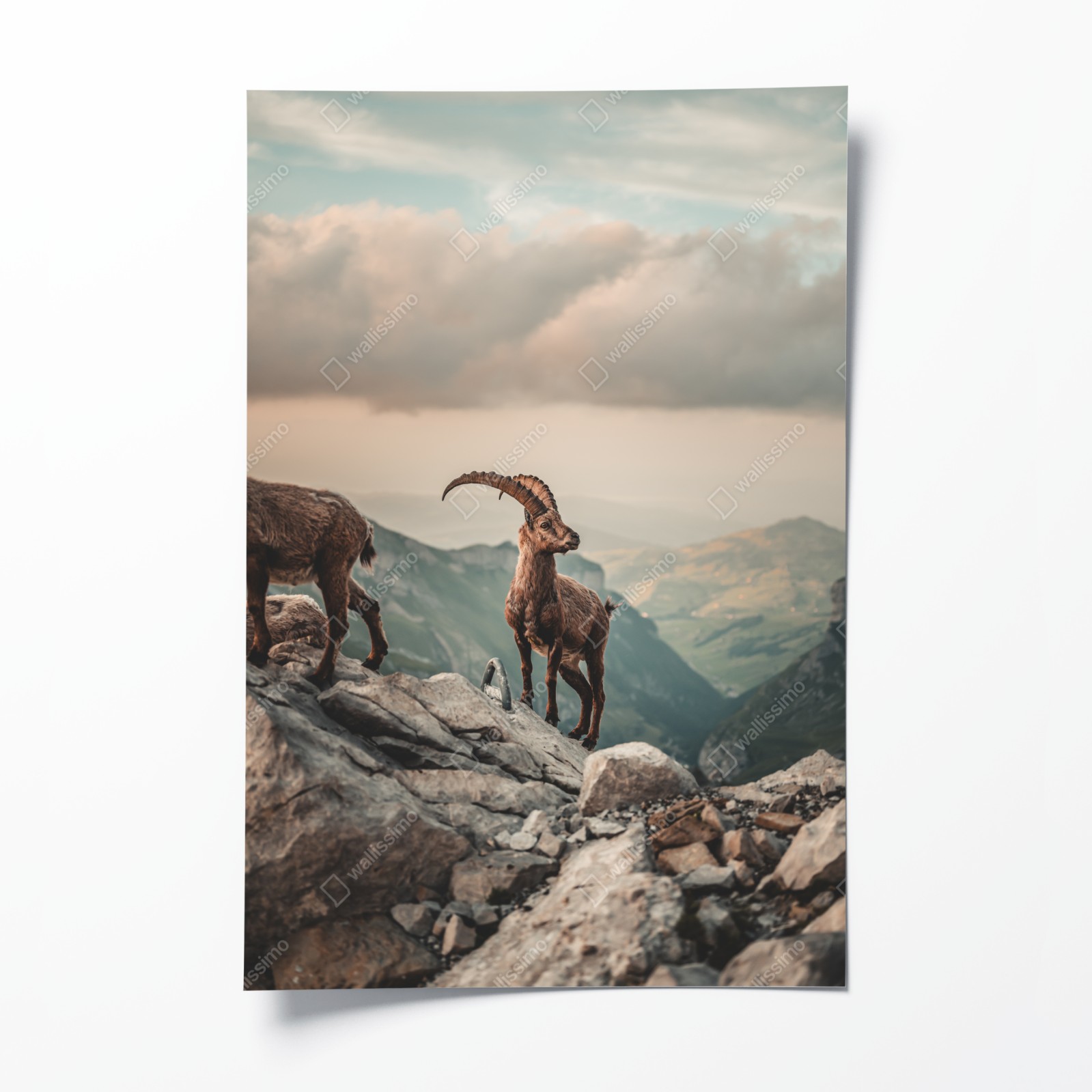 Bringen Sie wilde Alpenstimmung in Ihr Zuhause mit diesem ruhigen Foto eines Steinbocks auf einem felsigen Grat, das Abenteuer und Gelassenheit ausstrahlt.