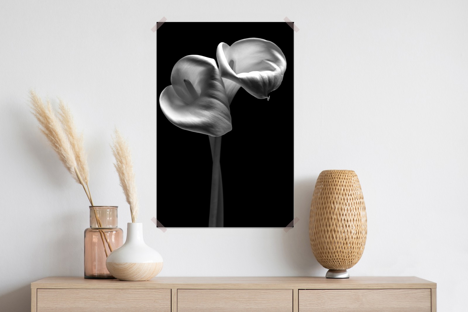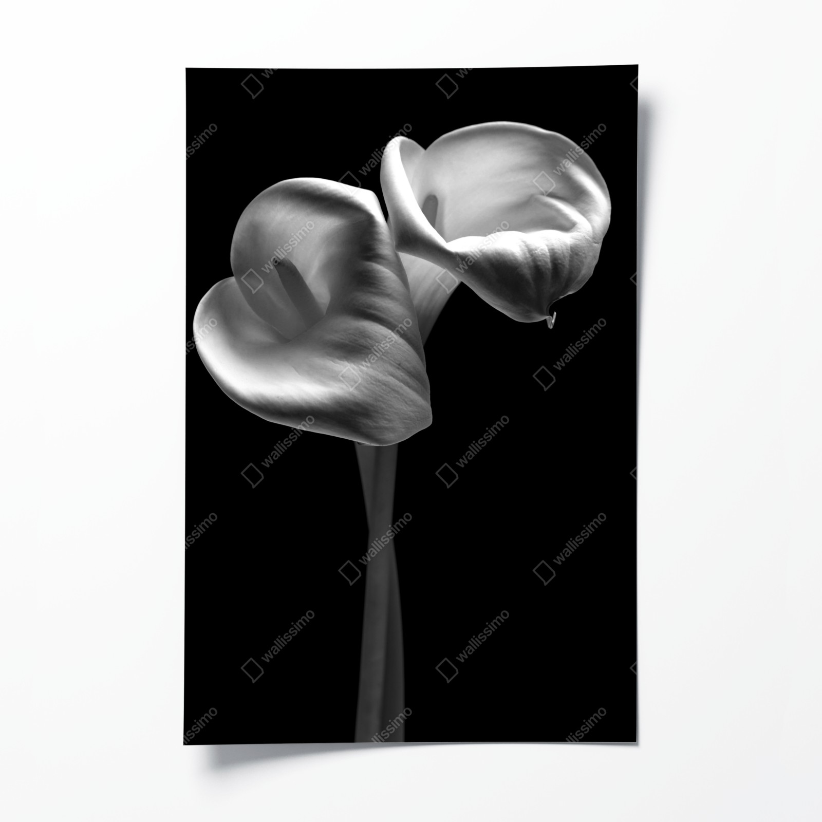 Bringen Sie pure Eleganz an Ihre Wand mit dieser Schwarzweißaufnahme von Calla-Blüten, ideal für moderne, minimalistische Räume.