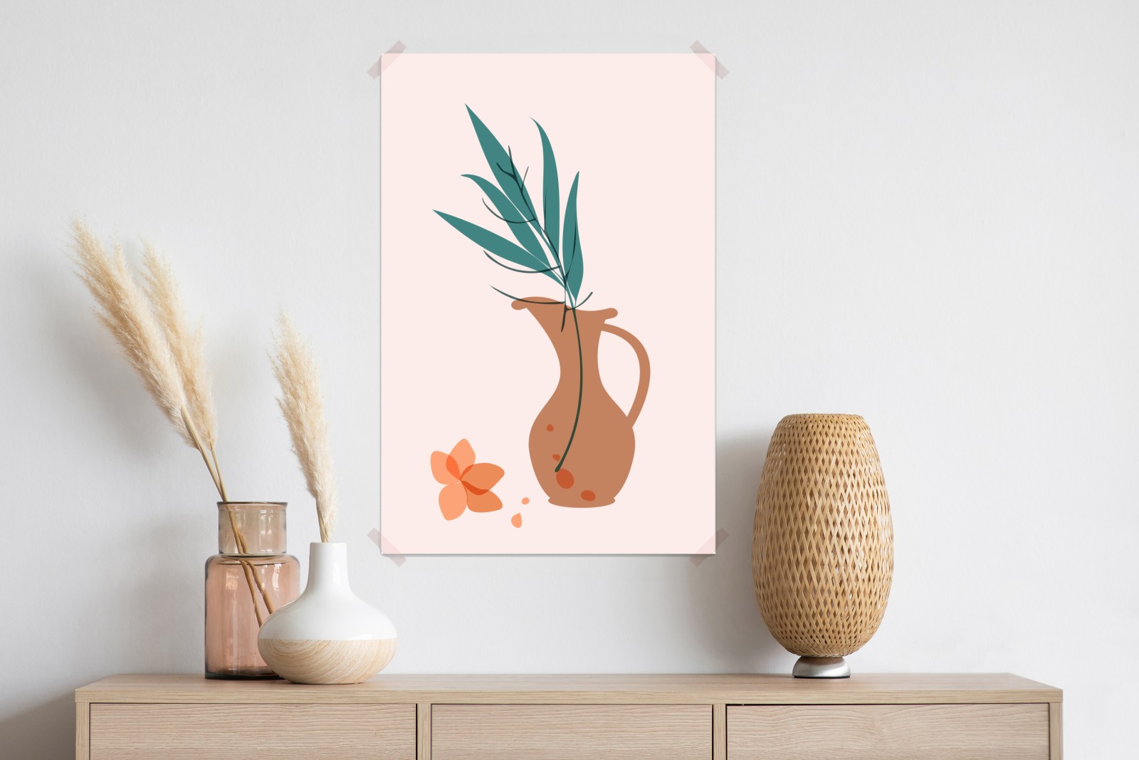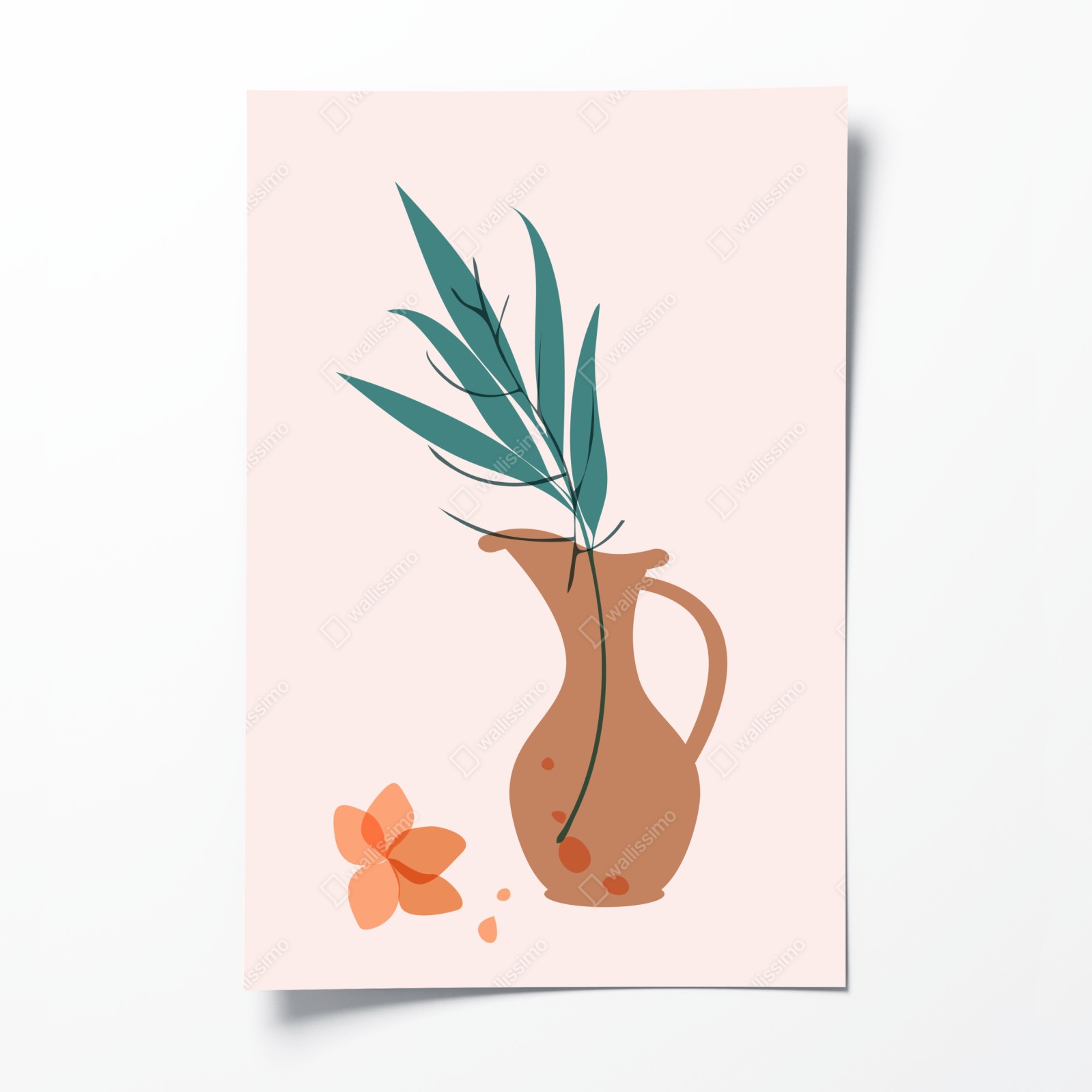 Fügen Sie Ihrem Raum einen beruhigenden botanischen Akzent hinzu mit dieser pastellfarbenen Illustration einer terrakottafarbenen Vase und grünen Blättern.