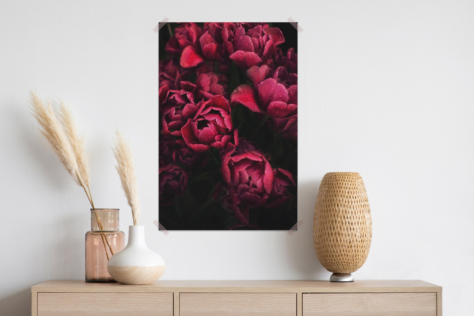 Verleihen Sie Ihren Wänden eine sanfte, stimmungsvolle Note mit nahaufgenommenen Blüten, die von Wassertropfen bedeckt sind.
