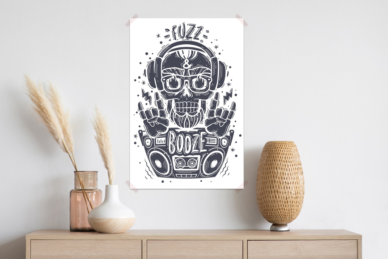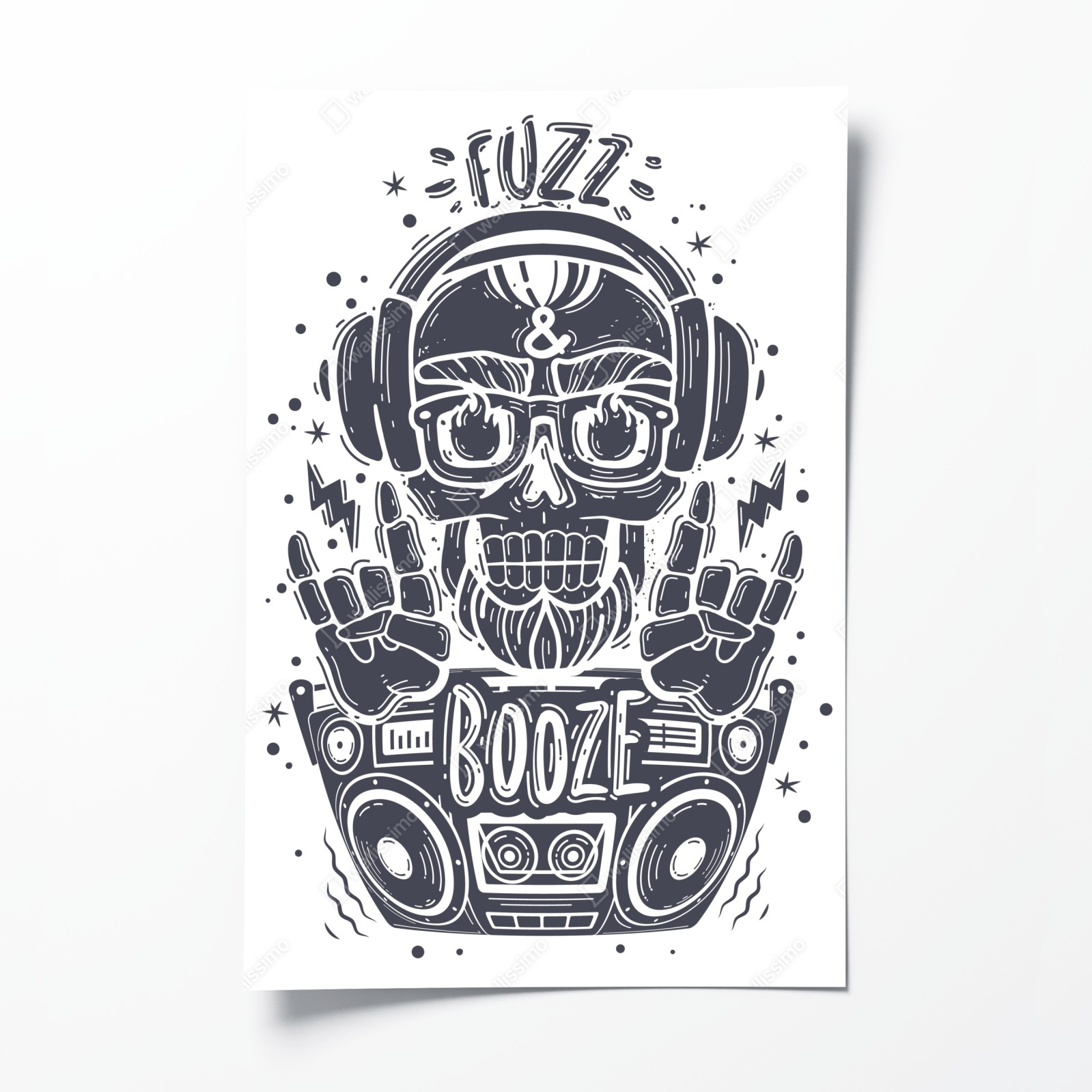 Bringen Sie urbanen Charakter in Ihr Zuhause mit dieser monochromen Illustration eines DJ-Schädels mit Boombox und Kopfhörern.