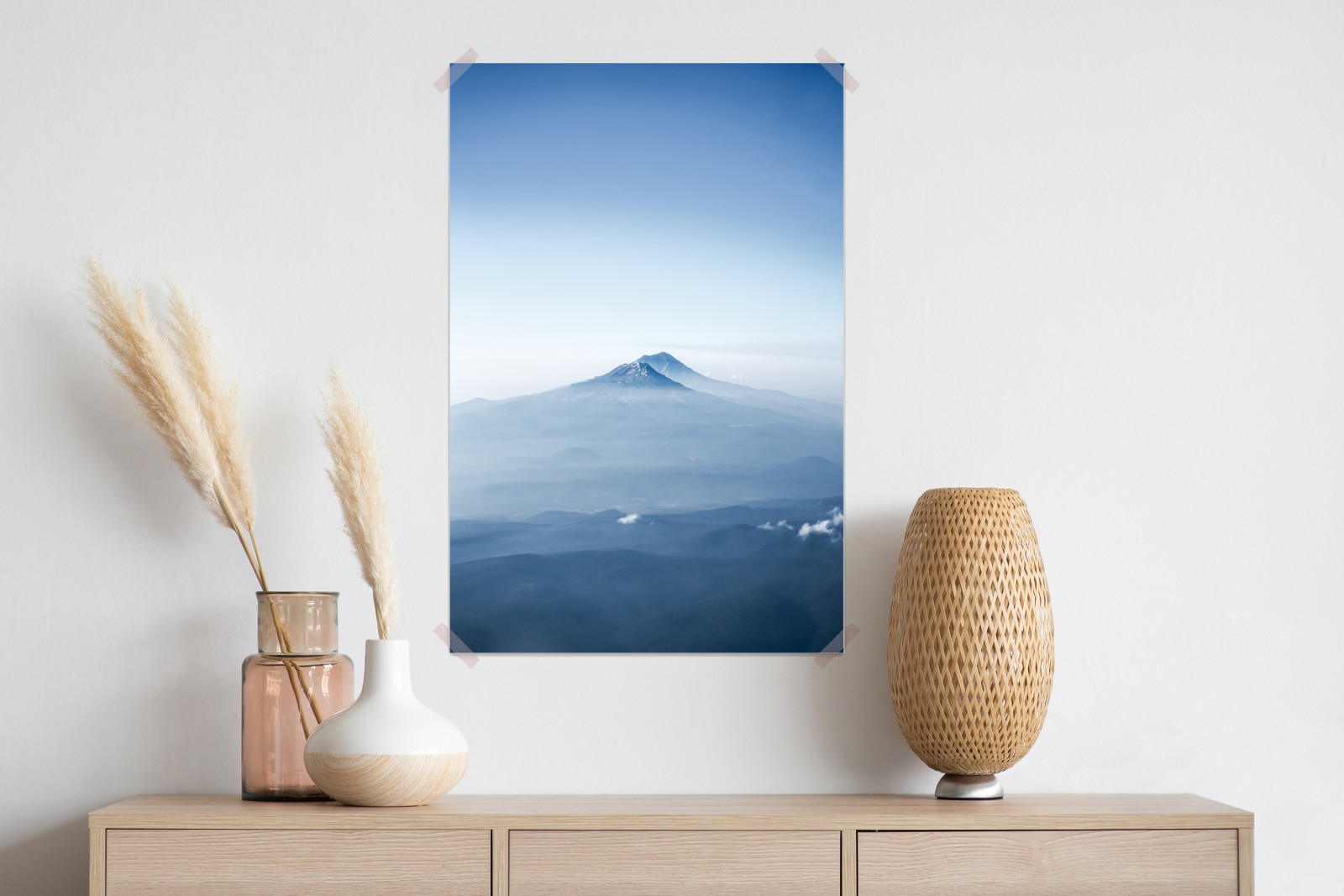 Bringen Sie Ruhe und Weite in den Raum mit einer nebligen blauen Berglandschaft, die Gelassenheit vermittelt.