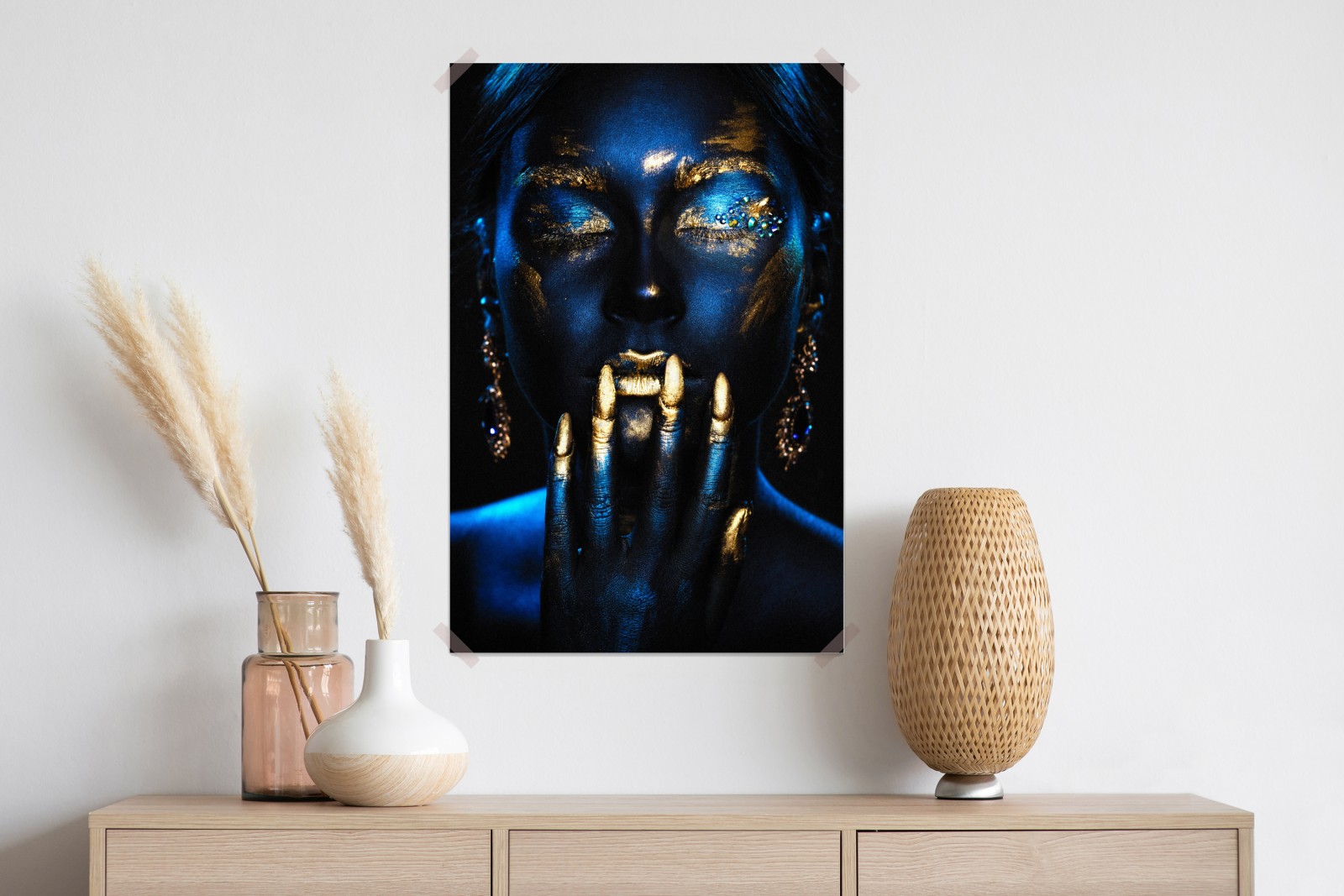 Beleuchten Sie Ihren Raum mit einem markanten Porträt, das tiefe Blautöne und metallische Goldakzente für ein mutiges, modernes Statement verbindet.