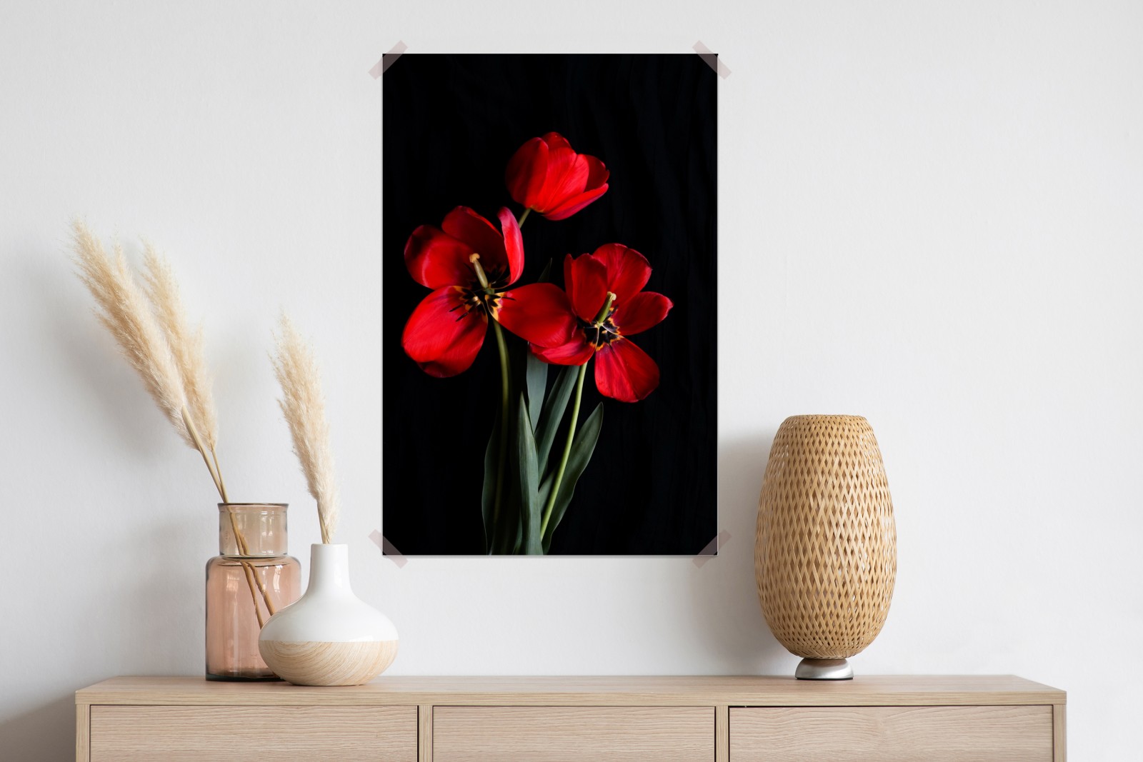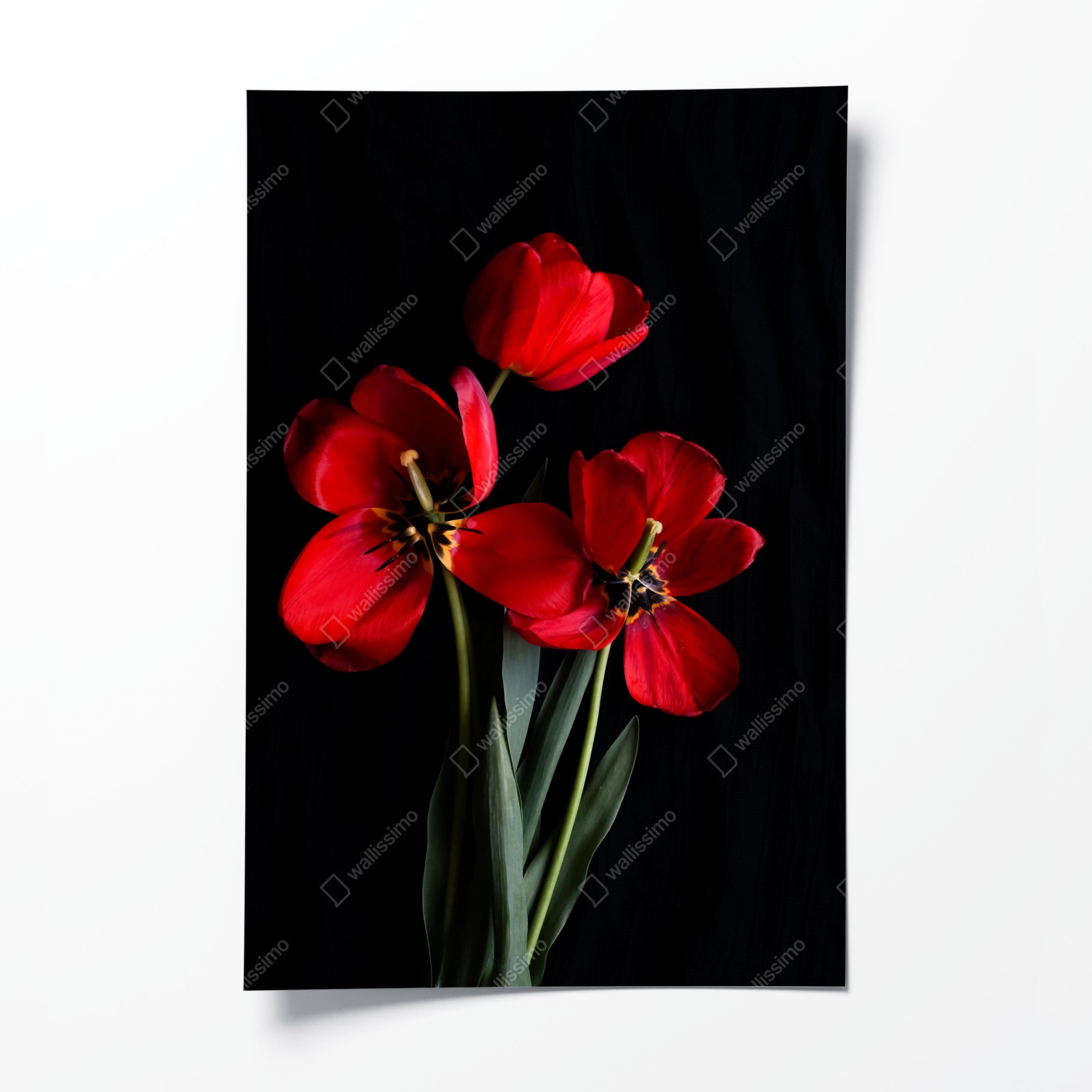 Poster Drei rote tulpen vor schwarzem hintergrund