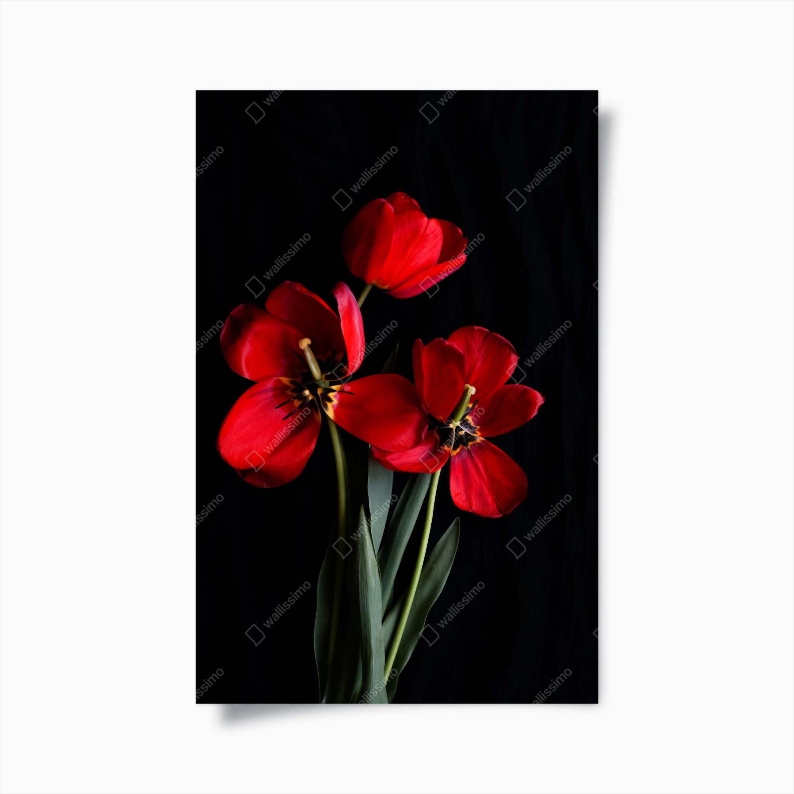 Poster Drei rote tulpen vor schwarzem hintergrund