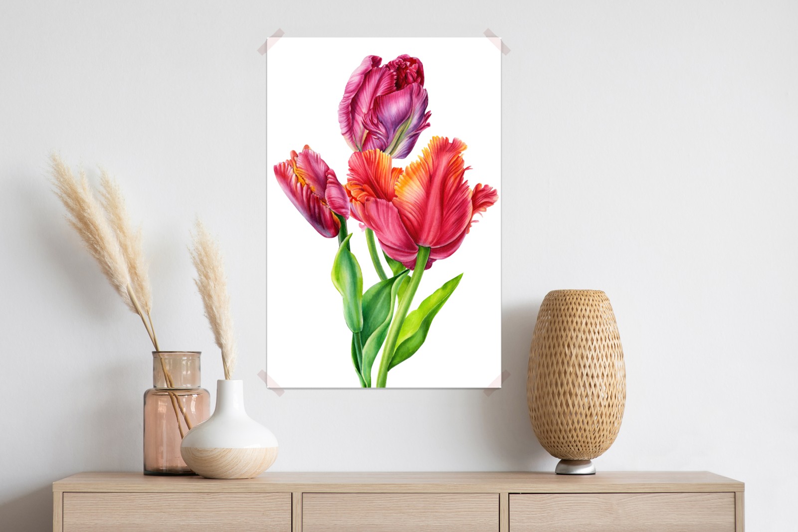 Bringen Sie frische Frühlingsstimmung in Ihr Zuhause mit leuchtenden rosa Tulpen in zarter Aquarellmalerei. Sanfte Farbtöne und feine Details schaffen eine beruhigende botanische Atmosphäre.
