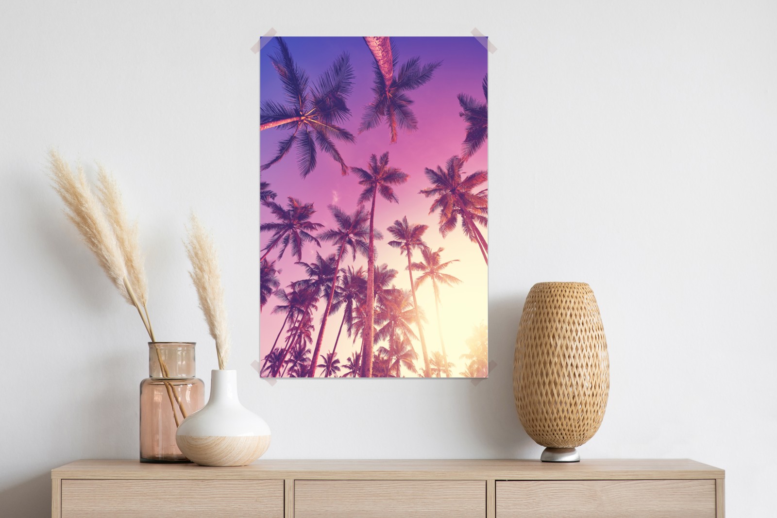 Bringen Sie tropisches Flair in Ihr Zuhause mit diesem stimmungsvollen Palmenmotiv bei Sonnenuntergang in intensiven Rosa- und Violetttönen.