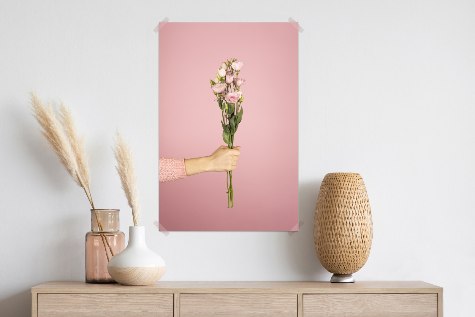 Bringen Sie sanfte Eleganz in Ihr Zuhause mit einem zarten rosa Eustoma-Strauß vor pastellfarbenem Hintergrund, perfekt für minimalistische Räume.