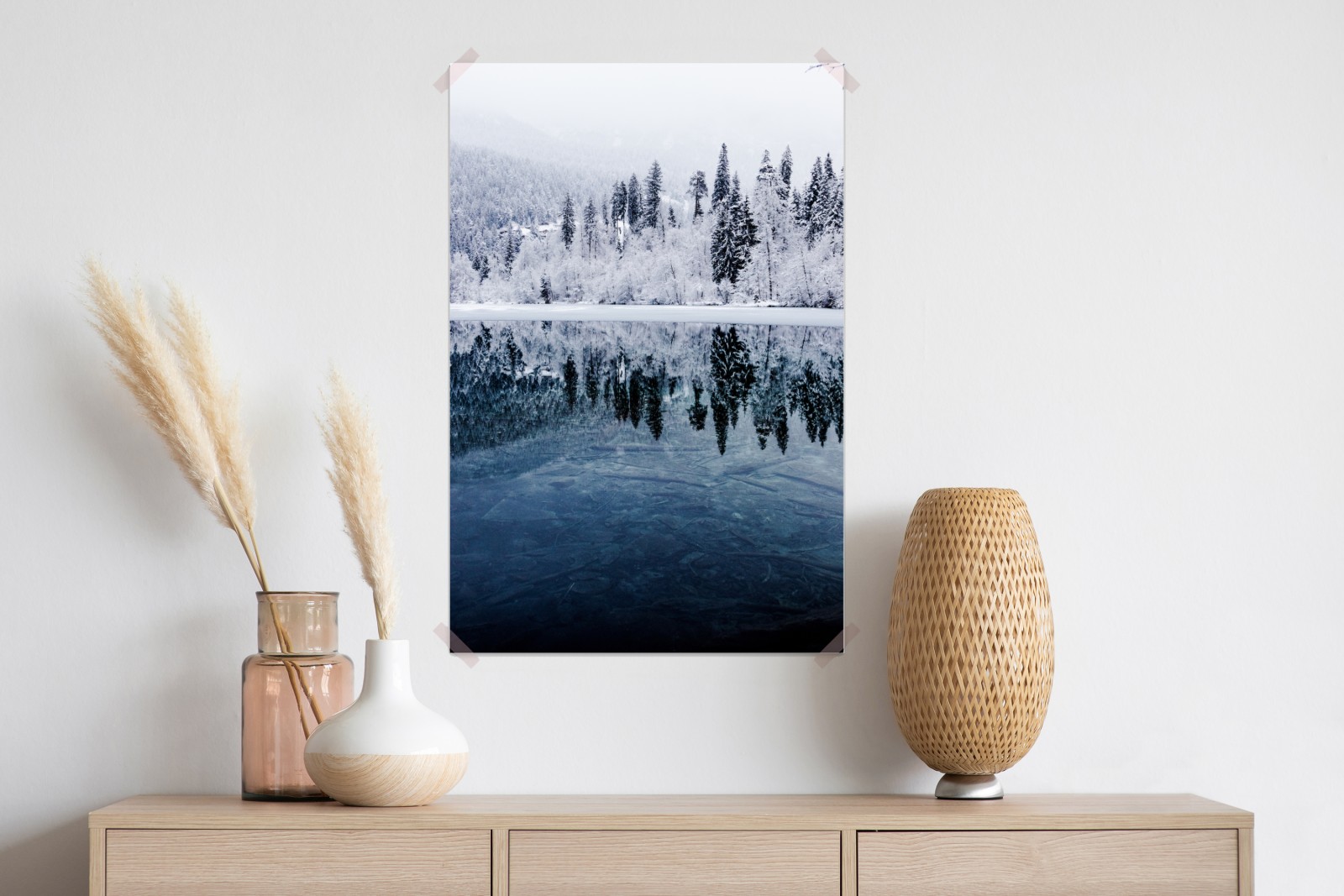Poster Winterlicher see mit spiegelung im verschneiten wald