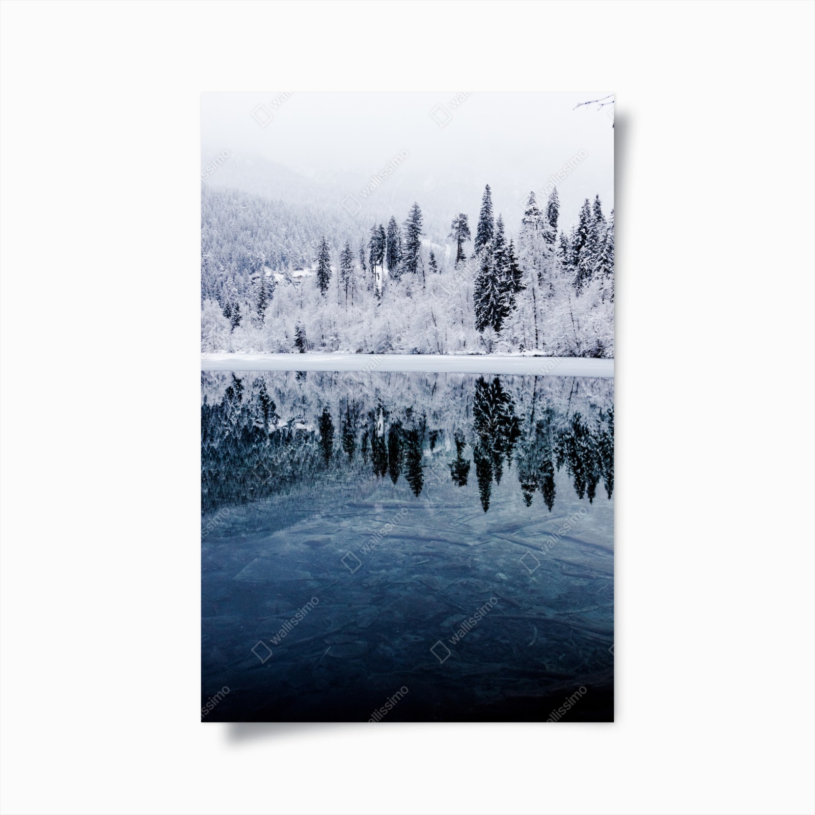 Poster Winterlicher see mit spiegelung im verschneiten wald
